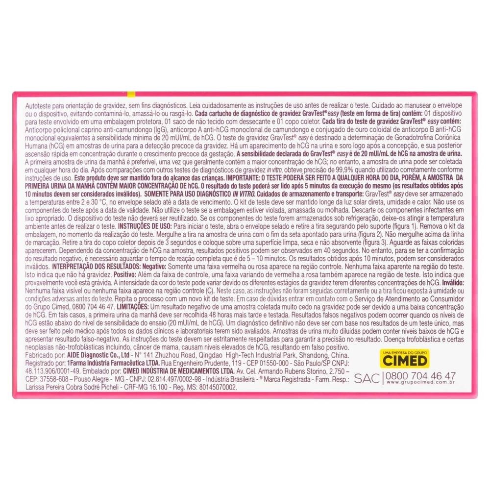 Indicação: O teste de gravidez GravTest easy é destinado a determinação de Gonadotrofina Coriônica Humana (hCG) em amostas de urina para a detectação precoce da gravidez. Modo de Uso: Para iniciar o teste, abra o envelope selado e retire a tira segurando pelo suporte. Remova o kit da embalagem, no momento da realização do teste. Mergulhe a tira na amostra de urina com o fim da seta apontando para urina. Não mergulhe acima da linha de marcação. Retire a tira do copo coletor depois de 3 segundos e coloque sobre uma superfície limpa, seca e não absorvente. Aguarde as faixas coloridas aparecerem. Dependendo da concentração de hCG na amostra, resultados positivos podem ser observados em 40 segundos. No entanto, para se ter a confirmação do resultado negativo, é necessário aguardar o tempo de reação completa que é de 5-10 minutos. Os resultados obtidos após 10 minutos, podem ser considerados inválidos. Interpretação dos resultados: Negativo: Somente uma faixa vermelha ou rosa aparece na região controle. Nenhuma faixa aparente na região do teste. isto indica que não há gravidez. Positivo: Além da faixa de controle, uma faixa variando de vermelha e rosa também aparece na região de teste. Isto indica que provavelmente você está grávida. Inválido: Nenhuma faixa visível ou nenhuma faixa aparece na região controle (C). Neste caso, as instruções não foram seguidas corretamente ou a tira ficou exposta á umidade ou condições adversas antes do teste. Repita o processo com um novo kit de teste. Recomendações e Orientações: Leia cuidadosamente as instruções de uso antes de realizar o teste. O teste poderá ser feito a qualquer hora do dia, porém, a amostra da primeira urina da manhã contém maior concentração de hCG. O resultado do teste poderá ser lido após 5 minutos da execução do mesmo (os resultados obtidos após 10 minutos devem ser considerados inválidos). A intensidade da cor do teste pode variar devido os diferentes estágios da gravidez terem diferentes concentrações de hCG. Em caso de dúvidas entrar em contato com o Serviço de Atendimento ao Consumidor do Grupo Cimed, 0800 704 4647. Limitações: Um resultado negativo de uma amostra coletada muito cedo na gravidez pode ser devido a uma baixa concentração de hCG. Em tais casos, a primeira urina da manhã deve ser recolhida 48 horas mais tarde e testada. Resultados falsos negativos podem ocorrer quando os níveis de hCG estão abaixo do nível de sensibilidade do ensaio (20 mUI/ml de hCG). Um diagnóstico definitivo não deve ser com base nos resultados de um teste único, mais deve ser feito pelo médico após todos os dados clínicos e laboratoriais terem sido avaliados. Amostras de urina muito diluídas podem conter níveis baixos de hCG e apresentar resultado falso-negativo. As instruções do teste devem ser estritamente respeitadas para garantir a precisão no resultado. Doença trofoblástica e certas neoplasias não-trofoblásticas incluindo, câncer de mama, causam níveis elevados de hCG, resultando em falso positivo. Advertência: Cuidado ao manusear o envelope ou o dispositivo, evitando contaminá-lo, amassá-lo ou rasgá-lo. Não utilize o teste se a embalagem estiver violada, amassada ou molhada. O dispositivo do teste não deverá ser reutilizado. Este produto deve ser mantido fora do alcance de crianças. Somente para uso diagnóstico "in vitro".
