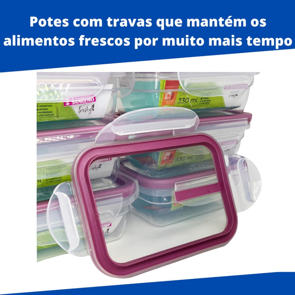 Com um design funcional e elegante, a nova linha de potes Freshy da Sanremo vêm com travas resistentes e borracha integrada que permite melhor vedação e conservação dos alimentos. Seu modelo é super funcional permitindo empilhamento seguro e organizado. Ideal para uma rotina mais leve e prática. Feito com matéria prima virgem, é atóxico, livre de BPA, pode ir ao micro-ondas, freezer e lava louças. Segurança para você e sua família: material livre de BPA, material não tóxico. Medidas: Altura: 5,6cm Largura: 10,2cm Comprimento: 13cm Contém: 4 unidades DÚVIDAS FREQUENTES: 1 - Os produtos são novos? R: Todos os produtos são novos e com garantia. 2 - A mercadoria está disponível à pronta entrega? R: Todas as mercadorias são para pronta entrega. 3- Vocês fazem entregas para todo o país? R: Sim, através dos correios e transportadoras.
