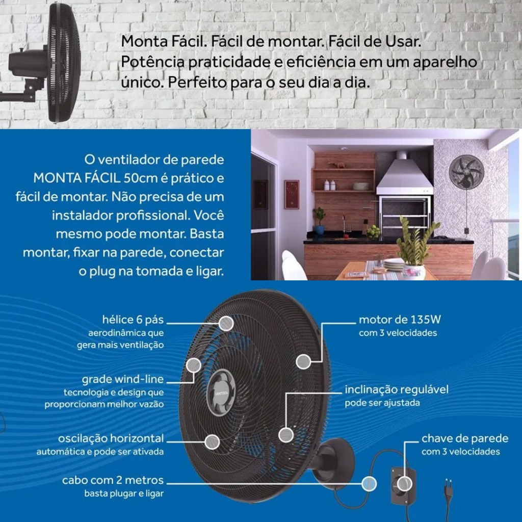 1 COMPRA = 4 VENTILADORES! Kit 4 Ventiladores Profissionais de parede oscilante 50cm 6 pás 135w de Potência - Monta Fácil Ventisol. Ar mais refrescante para sua loja, restaurante, escola, igreja, academia, mercado, Galpão, oficina, garagem, pet shop. Indicado para grandes áreas que precisem de ventilação, é capaz de refrescar grandes ambientes deixando o ar mais fresco e confortável. Confira a ficha técnica abaixo. Nota fiscal | Envio imediato | Garantia 12 meses | Produto em Estoque | Frete grátis. - ESPECIFICAÇÕES: Marca: Ventisol Modelo: Parede Monta Fácil Cor: Preto Potência: 135W Voltagem: 110V ou 220V - CARACTERÍSTICAS: Rotação: 1590 rpm Vazão: 1,40m3/s Quantidade de pás: 6 Velocidades: 3 Oscilação horizontal automática Motor turbo Inclinação regulável - PESO E DIMENSÕES: Peso: 1,99 kg Diâmetro: 52 cm Profundidade: 40 cm - AVISO LEGAL Certificado pela INMETRO. Dúvidas frequentes Todos os produtos estão a pronta entrega. Todos os produtos são 100% originais, com nota fiscal e garantia de fábrica. Produtos novos e lacrados na caixa. Envio imediato. Entrega garantida ou seu dinheiro de volta. Facilitamos a troca ou a devolução, se necessário, para nós é sempre um prazer satisfazer suas expectativas. Ótimo atendimento de forma clara, empática, objetiva e rápida. Tire suas dúvidas nas perguntas estamos prontos para te atender. AGUARDAMOS SUA COMPRA!
