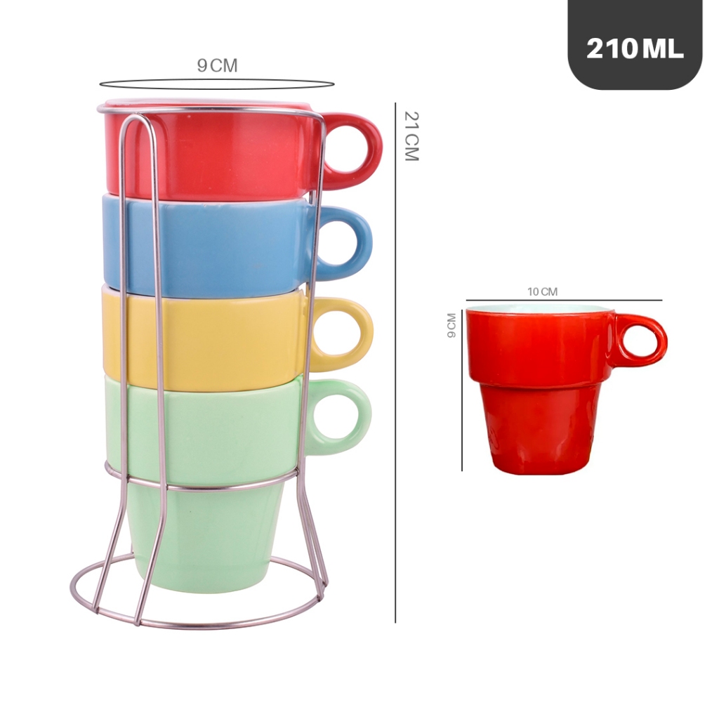 Kit 4 Xícaras 210ml Coloridas Empilháveis com Suporte Metálico Cerâmica Arco-Íris