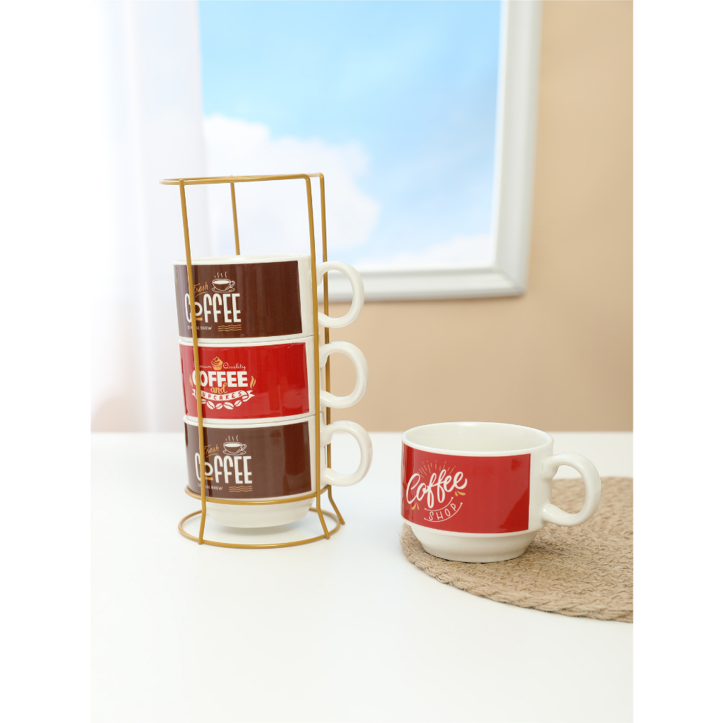Kit 4 Xícaras Cerâmicas + 1 Suporte Torre de Metal 160ml Café Chá