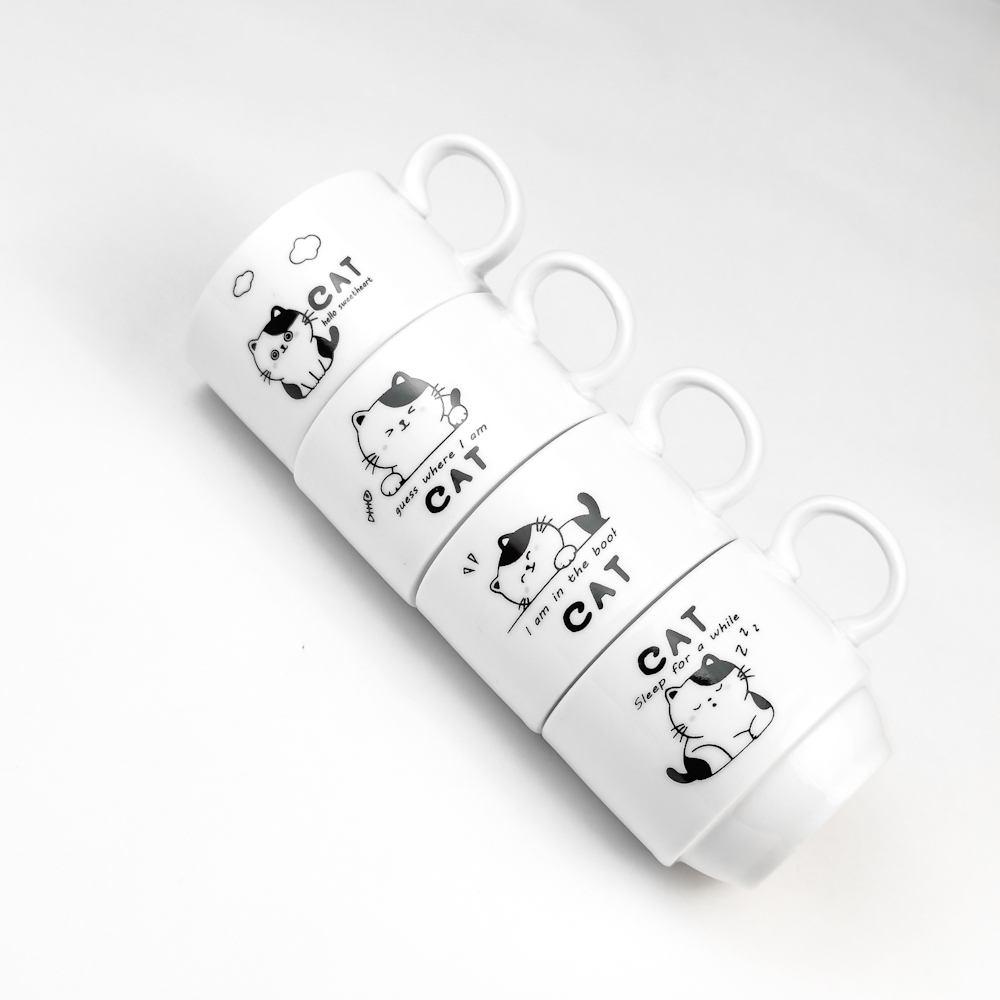 Kit 4 Xícaras Cerâmicas + 1 Suporte Torre de Metal 160ml - Pets/Gatinhos