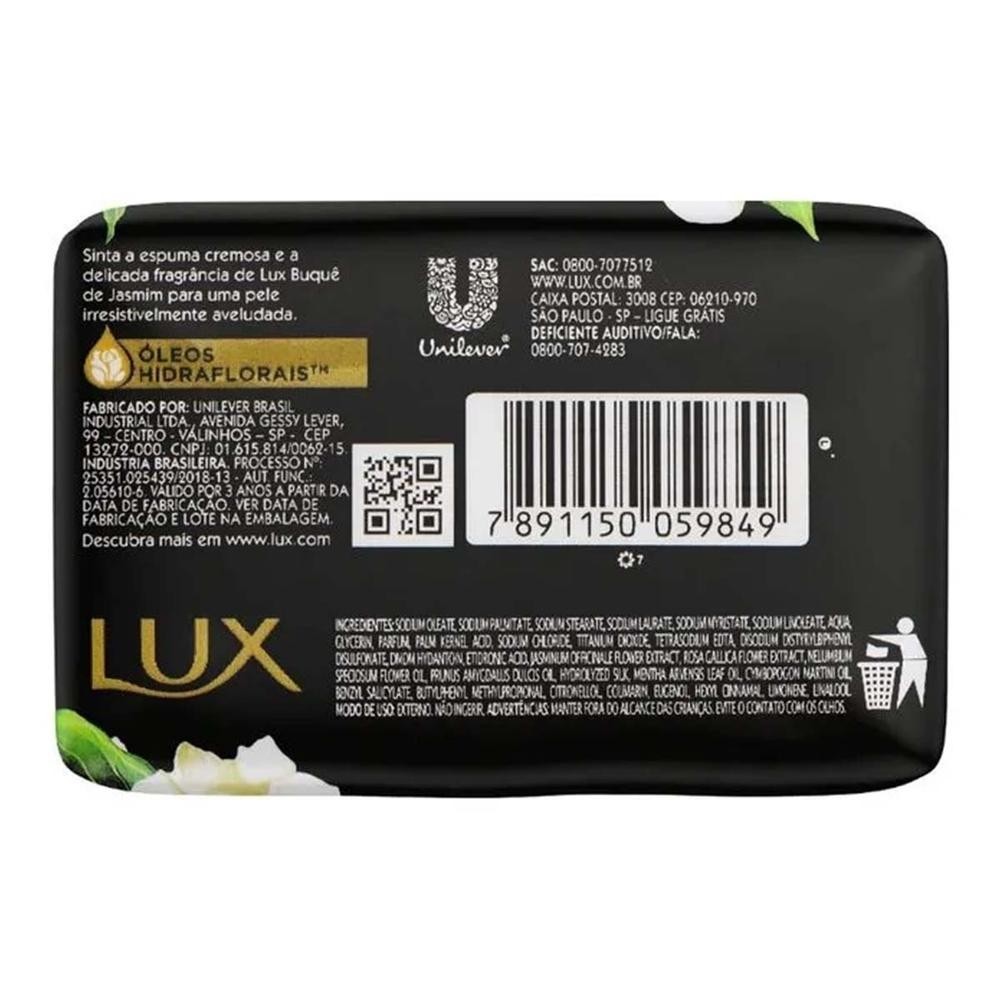 Lux Sabonete em Barra Buquê De Jasmim : Fragrância Floral para uma Experiência Luxuosa Descrição do Produto: Lux Sabonete em Barra Buquê De Jasmim é formulado com glicerina e extratos naturais de rosas, proporcionando uma limpeza delicada e eficaz, enquanto deixa a pele suavemente perfumada com a fragrância luxuosa de rosas francesas. Cada barra é envolvida em um delicado envoltório, garantindo sua qualidade e frescor até o momento de uso. Benefícios para a Pele: Fragrância envolvente:A fragrância floral proporciona uma experiência sensorial única durante o banho, deixando a pele perfumada e revigorada. Hidratação suave:A fórmula enriquecida com glicerina ajuda a manter a pele hidratada e macia, mesmo após o uso. Limpeza delicada:Os ingredientes suaves garantem uma limpeza eficaz sem ressecar a pele, deixando-a limpa e refrescante. Envoltório protetor:Cada barra de sabonete é cuidadosamente envolvida em um envoltório protetor, garantindo sua integridade e frescor até o momento de uso. Instruções de Uso: Massagear Sobre A Pele Molhada Até Formar Espuma. Enxágue Em Seguida. Advertências Importantes: Uso externo. Mantenha fora do alcance de crianças. Evite o contato com os olhos. Em caso de contato, enxágue abundantemente com água. Em caso de irritação, suspenda o uso e consulte um médico. Composição: Sodium stearate, sodium oleate, sodium palmitate, sodium linoleate, sodium laurate, sodium myristate, aqua, glycerin, parfum, sodium citrate, sodium chloride, citric acid, titanium dioxide, tetrasodium EDTA, etidronic acid, DMDM hydantoin, CI 12490, sericin, jasminum officinale flower extract, rosa gallica flower extract, nelumbium speciosum flower oil, prunus amygdalus dulcis oil, cymbopogon martini oil, mentha arvensis leaf oil, alpha-isomethyl ionone, citronellol, coumarin, geraniol, hexyl cinnamal. Linalool.
