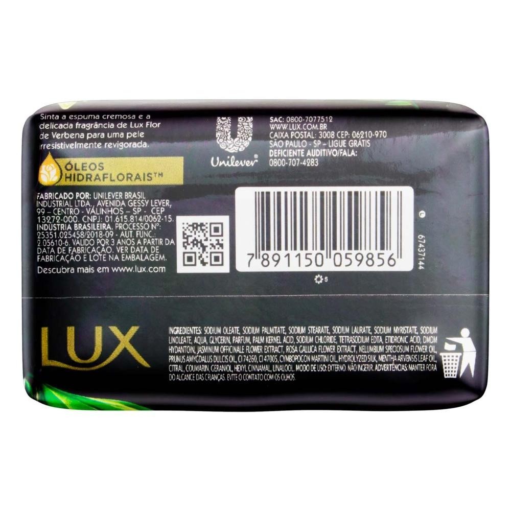 Lux Sabonete em Barra Flor De Verbena: Fragrância Floral para uma Experiência Luxuosa Descrição do Produto: Lux Sabonete em Barra Flor De Verbena é formulado com glicerina e extratos naturais de rosas, proporcionando uma limpeza delicada e eficaz, enquanto deixa a pele suavemente perfumada com a fragrância luxuosa de Flor de Verbena. Cada barra é envolvida em um delicado envoltório, garantindo sua qualidade e frescor até o momento de uso. Benefícios para a Pele: Fragrância envolvente:A fragrância floral proporciona uma experiência sensorial única durante o banho, deixando a pele perfumada e revigorada. Hidratação suave:A fórmula enriquecida com glicerina ajuda a manter a pele hidratada e macia, mesmo após o uso. Limpeza delicada:Os ingredientes suaves garantem uma limpeza eficaz sem ressecar a pele, deixando-a limpa e refrescante. Envoltório protetor:Cada barra de sabonete é cuidadosamente envolvida em um envoltório protetor, garantindo sua integridade e frescor até o momento de uso. Modo de Uso: Umedecer o corpo, massagear a pele suavemente com a espuma do produto e enxaguar. Advertências Importantes: Uso externo. Mantenha fora do alcance de crianças. Evite o contato com os olhos. Em caso de contato, enxágue abundantemente com água. Em caso de irritação, suspenda o uso e consulte um médico. Composição: Sodium stearate, sodium oleate, sodium palmitate, sodium linoleate, sodium laurate, sodium myristate, aqua, glycerin, parfum, sodium citrate, sodium chloride, citric acid, titanium dioxide, tetrasodium EDTA, etidronic acid, DMDM hydantoin, CI 12490, sericin, jasminum officinale flower extract, rosa gallica flower extract, nelumbium speciosum flower oil, prunus amygdalus dulcis oil, cymbopogon martini oil, mentha arvensis leaf oil, alpha-isomethyl ionone, citronellol, coumarin, geraniol, hexyl cinnamal. Linalool.