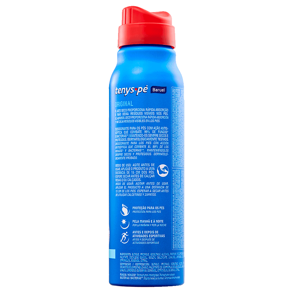 Kit 40 Unidades Tenys Pé Baruel Jato Seco Menta Fresh 92g Principais Características: • Fórmula com tecnologia Jato Seco que permite aplicação rápida e sem deixar resíduos. • Enriquecido com essência de menta, proporcionando sensação refrescante e revigorante. • Ação antisséptica eficaz para eliminar bactérias causadoras de odores. Benefícios: • Protege os pés contra o suor e o mau odor por longas horas. • Proporciona frescor intenso, ideal para dias quentes ou uso prolongado de calçados fechados. • Deixa os pés secos e confortáveis sem sensação pegajosa. Diferenciais do Produto: • Fragrância mentolada que oferece sensação refrescante imediata. • Pode ser aplicado também no interior dos calçados para maior proteção. • Produto dermatologicamente testado e de fácil aplicação. Especificações Técnicas: • Peso: 92g cada Instruções de Uso: Agite bem antes de usar. Aplique sobre os pés limpos e secos, mantendo a embalagem a cerca de 15 cm da pele. Também pode ser usado dentro dos calçados. Avisos e Precauções: • Uso externo. • Evitar contato com os olhos e mucosas. • Não aplicar em pele irritada ou lesionada. • Produto inflamável, manter longe de fogo ou superfícies aquecidas. • Manter fora do alcance de crianças. O que está incluso? 40 desodorante para os pés Tenys Pé Baruel Jato Seco Menta Fresh 92g ---- DÚVIDAS FREQUENTES ---- Os produtos são originais? Sim. Todos os nossos produtos são originais. Emitem nota fiscal? Sim. Emitimos nota fiscal para todos os pedidos.