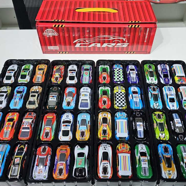 Kit 48 Carrinhos com Fricção de Lata Metálica Coloridos - Caixa Container que Vira Pista 8758