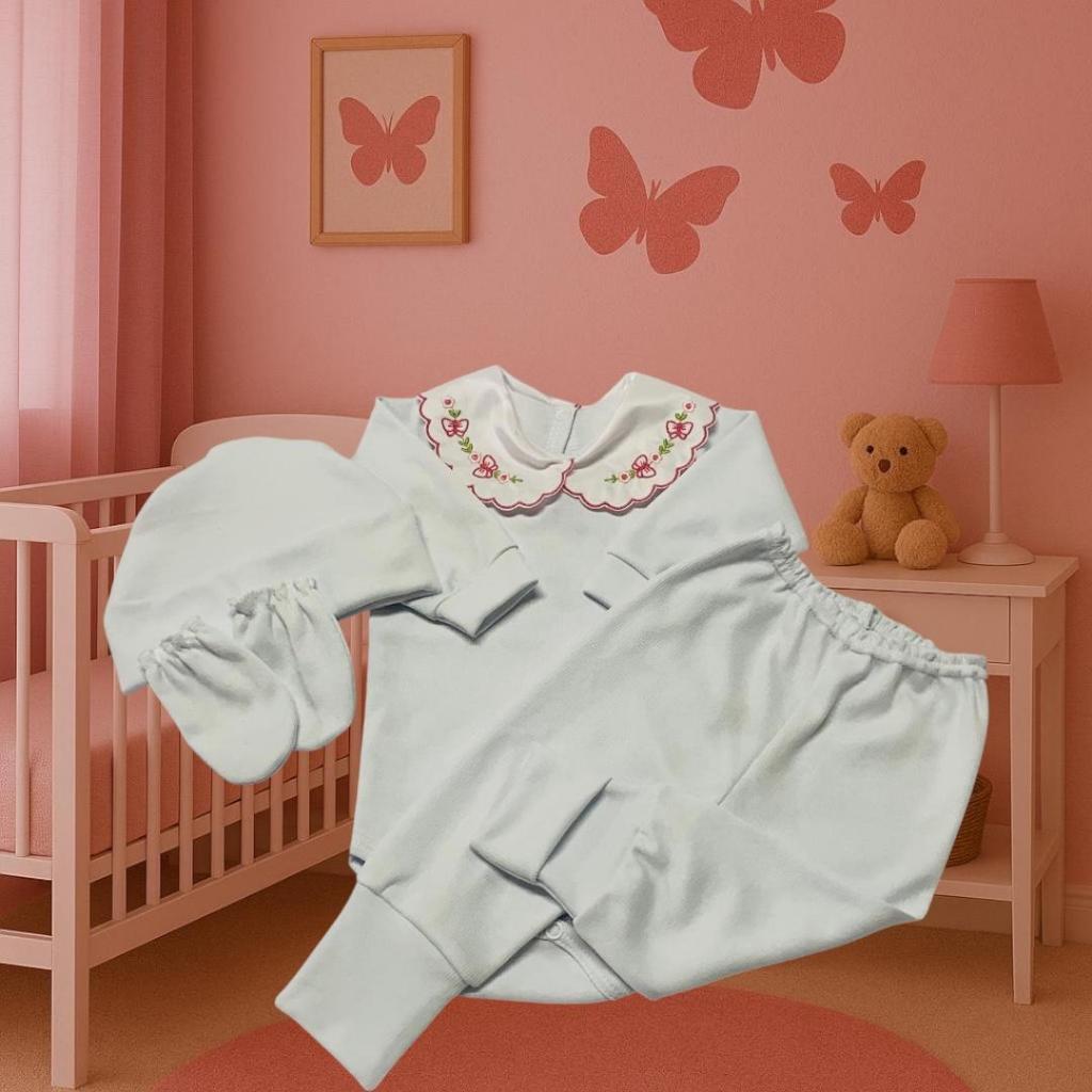 Kit 4pç – Body Bebê Gola Bordada + Calça Mijão Pé Reversível, Touca e Luva – Conforto e Charme