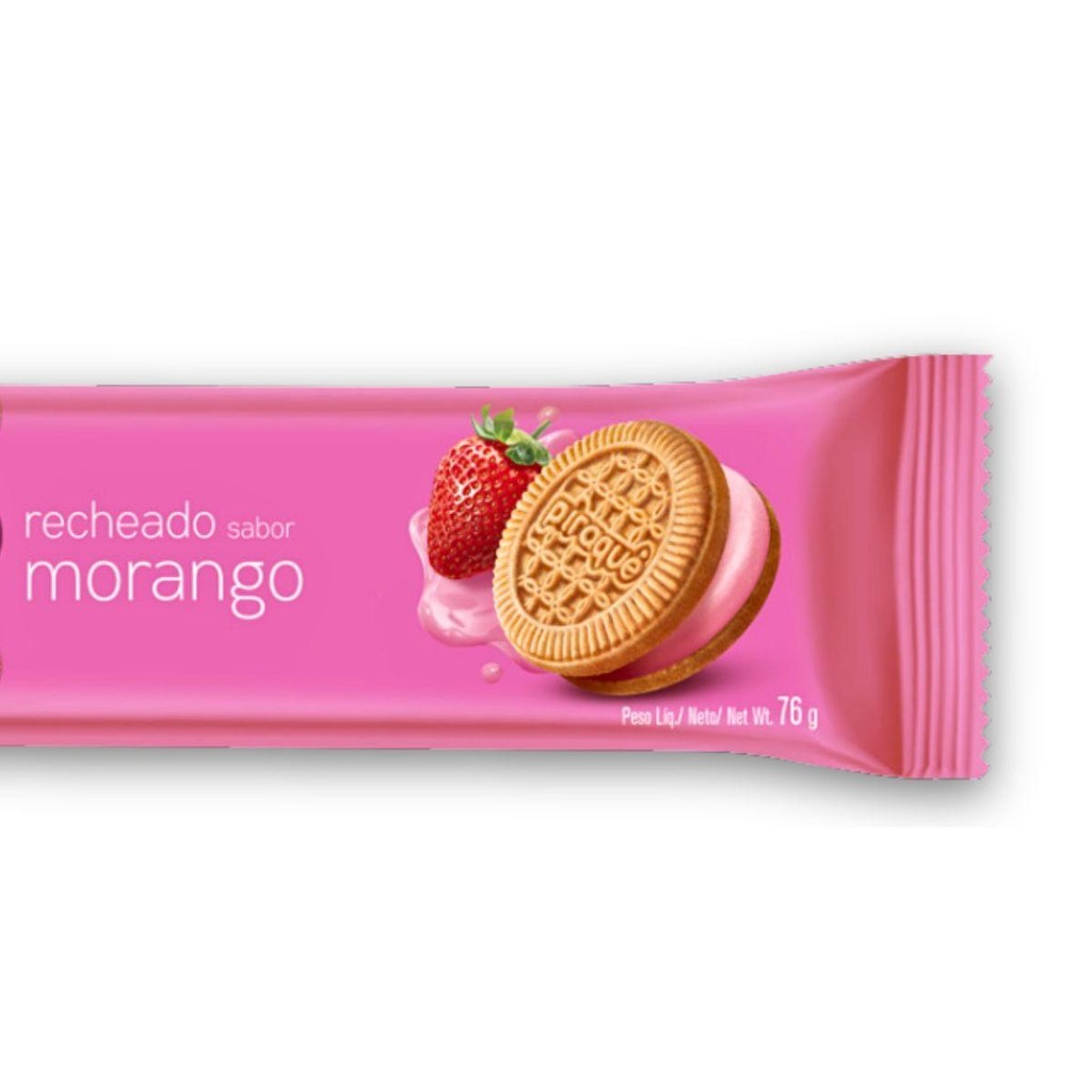 Biscoito Recheio Morango Piraquê Pacote 76g. IngredientesFarinha de trigo enriquecida com ferro e ácido fólico, açúcar, gordura vegetal, amido de milho, soro de leite em pó, açúcar invertido, extrato de malte, sal, fermentos químicos: bicarbonato de amônio, pirofosfato ácido de cálcio, bicarbonato de sódio e fosfato monocálcico, emulsificante lecitina de soja, aromatizantes e corante carmim.