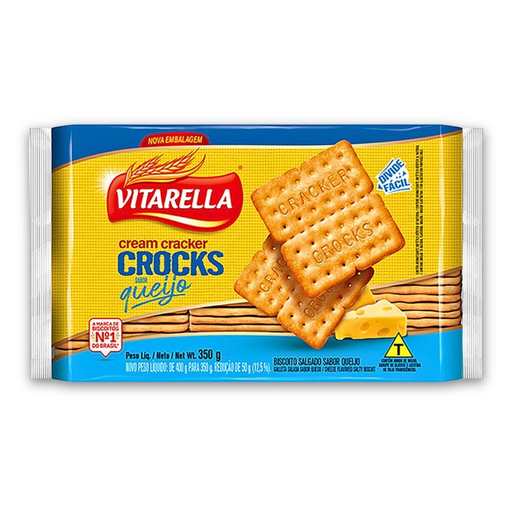 Biscoito Salgado Cream Cracker Queijo Vitarella Crocks Pacote 350g. Ingredientes:Farinha de trigo enriquecida com ferro e ácido fólico, gordura vegetal, xarope de glicose*, extrato de malte, soro de leite em pó, sal, açúcar, amido de milho*, fermentos químicos: bicarbonato de amônio e bicarbonato de sódio, aromatizante e emulsificante lecitina de soja.