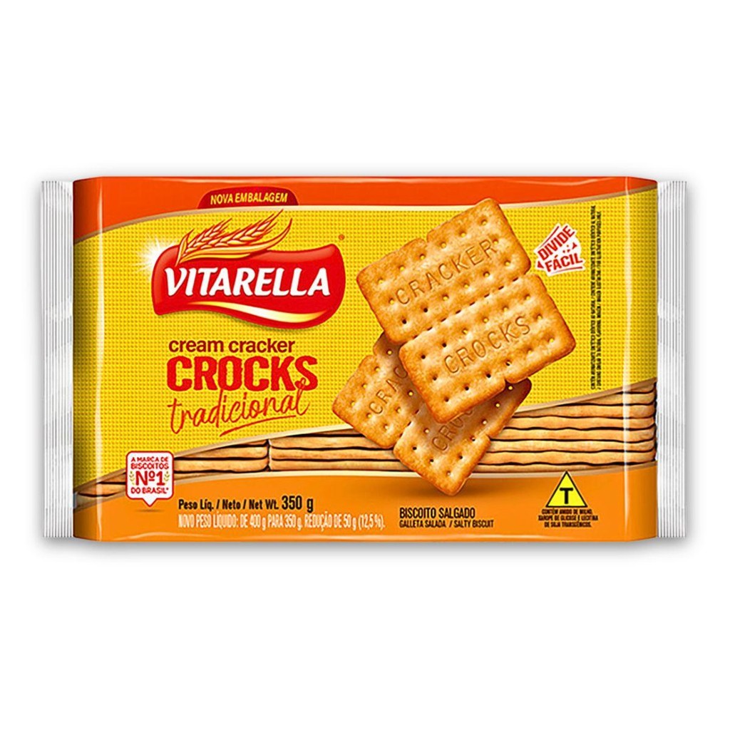 Biscoito Salgado Cream Cracker Tradicional Vitarella Crocks Pacote 350g. Ingredientes: Farinha de trigo enriquecida com ferro e ácido fólico, gordura vegetal, xarope de glicose*, extrato de malte, soro de leite em pó, sal, açúcar, amido de milho*, fermentos químicos: bicarbonato de amônio e bicarbonato de sódio, aromatizante e emulsificante lecitina de soja*.