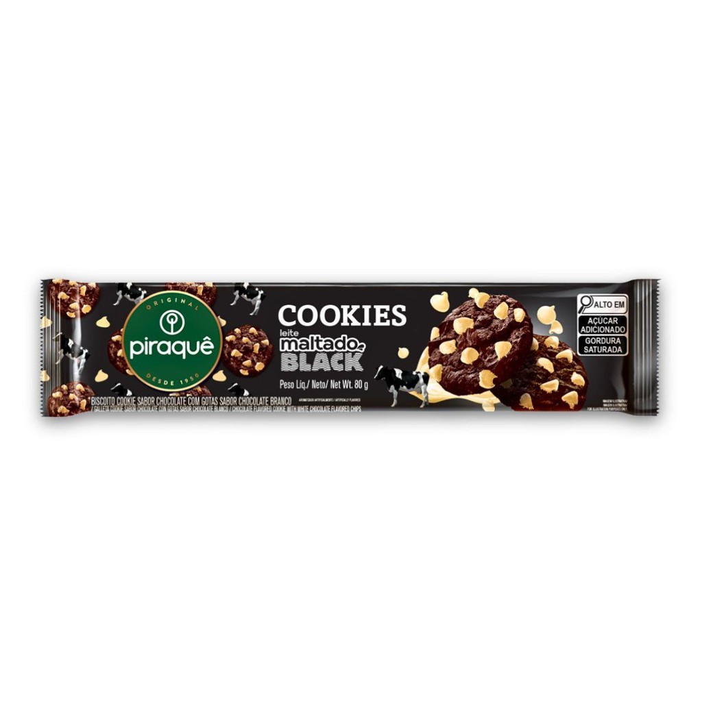 Biscoito Cookie Leite Maltado Black Chocolate com Gotas de Chocolate Branco Piraquê Pacote 80g. Ingredientes: Farinha de trigo enriquecida com ferro e ácido fólico, gotas sabor chocolate branco (açúcar, gordura vegetal, leite em pó integral, soro de leite, estabilizante triestearato de sorbitana, emulsificante lecitina de soja e aromatizante), gordura vegetal, açúcar, soro de leite em pó, cacau em pó, extrato de malte, sal, amido de milho, corante caramelo IV, fermentos químicos: bicarbonato de amônio, difosfato dissódico e bicarbonato de sódio, emulsificantes: lecitina de soja e ésteres de mono e diglicerídeos de ácidos graxos com ácido diacetil tartárico, aromatizantes e antioxidante BHT.