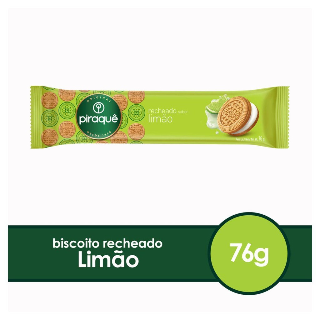 Biscoito Recheio Limão Piraquê Pacote 76g. Ingredientes:Farinha de trigo enriquecida com ferro e ácido fólico, açúcar, gordura vegetal, amido de milho, soro de leite em pó, açúcar invertido, extrato de malte, sal, fermentos químicos: bicarbonato de amônio, pirofosfato ácido de cálcio, bicarbonato de sódio e fosfato monocálcico, emulsificante lecitina de soja e aromatizantes.