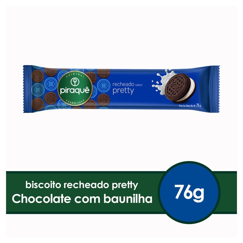 Biscoito Recheio Pretty Piraquê Pacote 76g. Ingredientes: Farinha de trigo enriquecida com ferro e ácido fólico, açúcar, gordura vegetal, amido de milho, cacau em pó, soro de leite em pó, açúcar invertido, extrato de malte, sal, fermentos químicos: bicarbonato de amônio, bicarbonato de sódio, pirofosfato ácido de cálcio e fosfato monocálcico, emulsificante lecitina de soja e aromatizantes.
