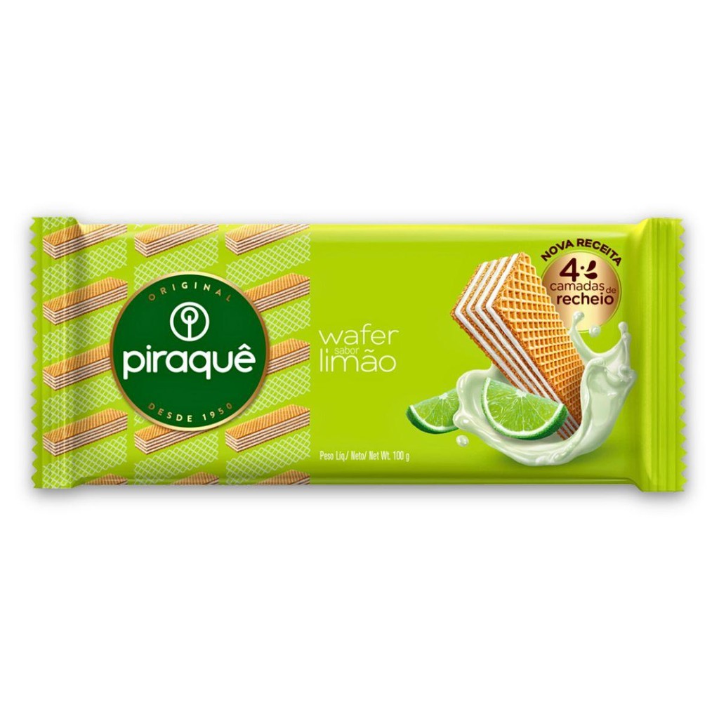 Biscoito Wafer Recheio Limão Piraquê Pacote 100g. Ingredientes:Açúcar, farinha de trigo enriquecida com ferro e ácido fólico, gordura vegetal, sal, emulsificante lecitina de soja*, aromatizante e fermento químico bicarbonato de sódio.
