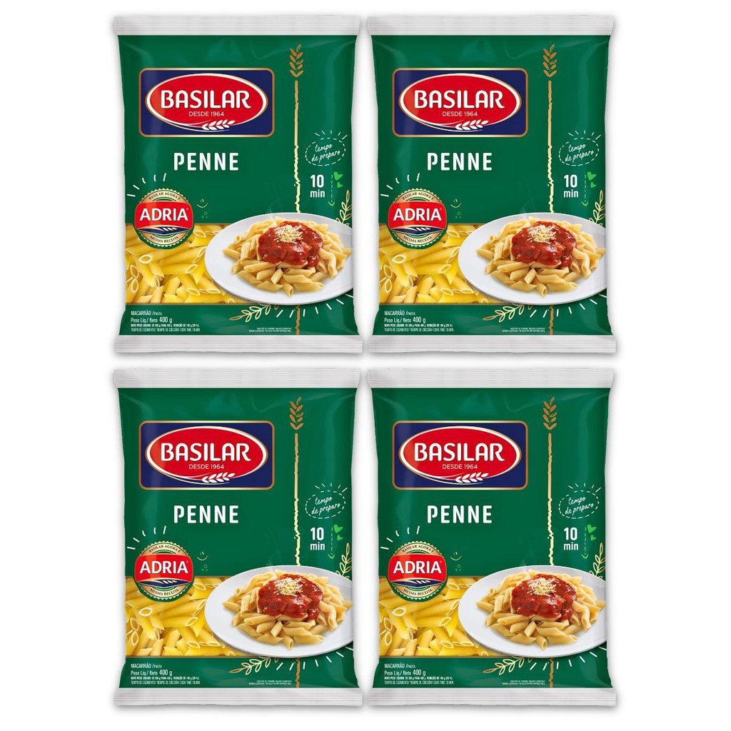 Pack 4unidades de Macarrão de Sêmola Penne Basilar Pacote 400g. Pack 4unidades de Macarrão de Sêmola Penne Basilar Pacote 400g.