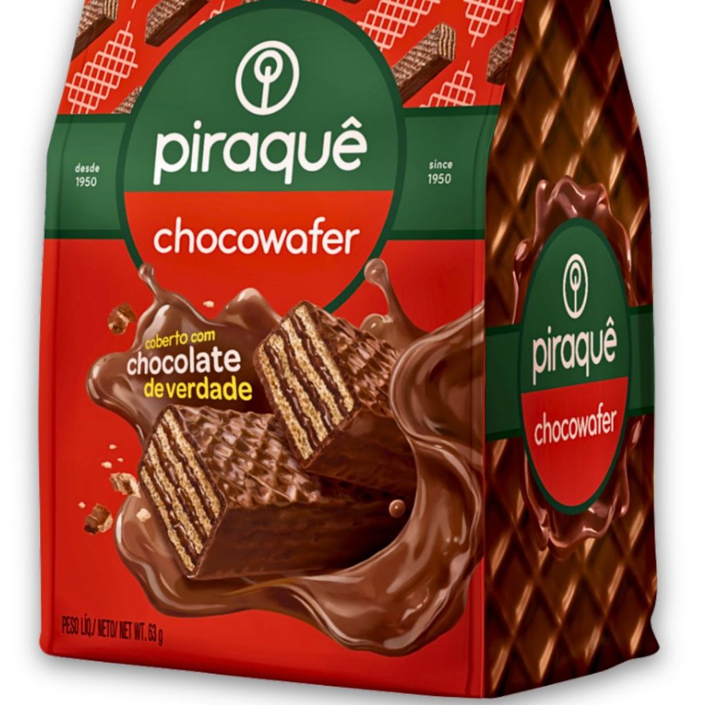Wafer Recheio e Cobertura Chocolate Piraquê Chocowafer Pacote 63g. Ingredientes:Chocolate meio amargo (açúcar, liquor de cacau, gordura vegetal, manteiga de cacau, emulsificantes: lecitina de soja* e poliglicerol polirricinoleato e aromatizante), açúcar, farinha de trigo enriquecida com ferro e ácido fólico, gordura vegetal, cacau em pó, soro de leite em pó, farinha de soja integral, farinha de amendoim, sal, emulsificante lecitina de soja*, fermento químico bicarbonato de sódio e aromatizante.