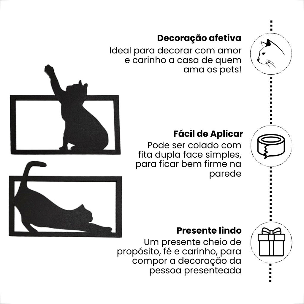 Kit 4 Plaquinhas Decorativas de Gatos em MDF Preto – Decoração Pet para Parede Leve charme, personalidade e amor pelos felinos para qualquer cantinho da casa! Este kit com 4 plaquinhas decorativas de gatos em MDF preto é a escolha perfeita para quem ama pets e busca um toque moderno e criativo na decoração da parede. As plaquinhas pet com silhuetas de gatinhos trazem um estilo artesanal e minimalista que combina com diversos ambientes. MEDIDAS QUADRINHOS: - Altura: 7,5 cm - Comprimento: 9,5 cm - Quarteto: 17cm x 21cm BENEFÍCIOS DO PRODUTO: - Decoração temática para sala, quarto, escritório ou pet shop - Plaquinha decorativa gato com acabamento em MDF preto de alta qualidade - Estilo quadro decorativo moderno e minimalista, ideal para espaços pet lovers - Representações fofas de gatos em diferentes poses: perfeito para quem busca uma decoração de gato em MDF - Ótima opção de presente para apaixonados por pets ou para complementar sua decoração casa pet lovers INCLUSO: - 4 unidades de quadros decorativos pet em MDF preto, modelo vazado APLICAÇÃO NA PAREDE: - Pode ser fixado com fita dupla face, cola quente ou tachinhas (não inclusos). Ideal para quem procura placa decorativa pet com instalação prática e rápida. Renove seu espaço com charme, estilo e muito amor pelos gatos. Adquira agora esse kit de plaquinhas MDF gato e transforme sua decoração com um toque felino!