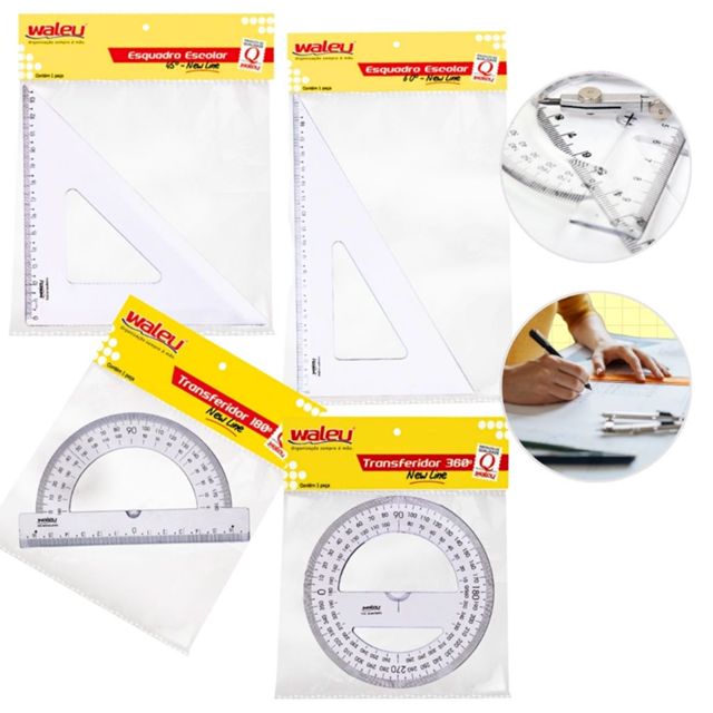 | Kit 4un Transferidor 180 e 360 Graus Esquadro 45 e 60 Graus Escolar... este produto | R$ 18,51 | 7% | 5.0/5 | 2 |