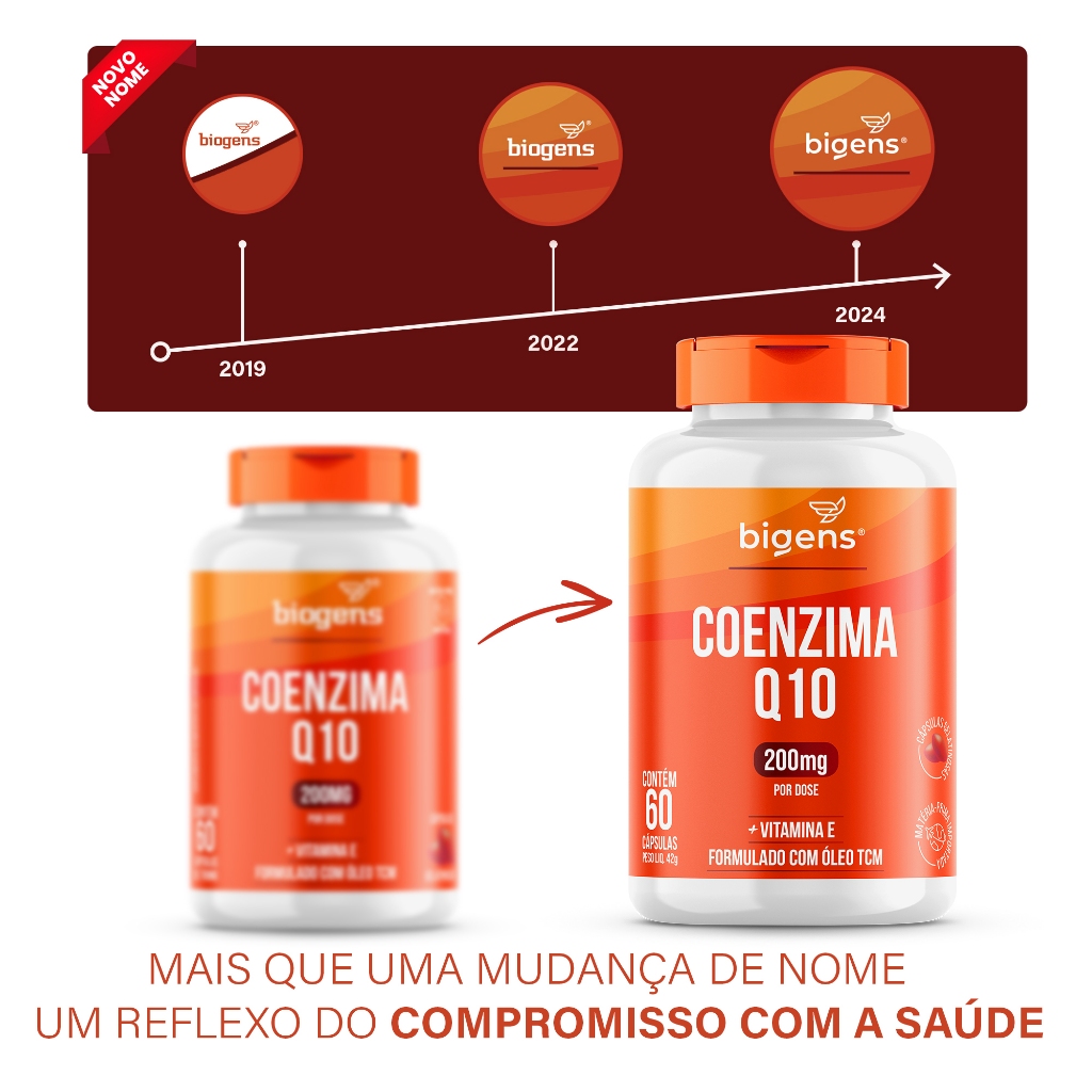 Kit4 Coenzima Q10 200mg com vitamina E 10mg, alta concentração, 60 cápsulas, Bigens A produção de Coenzima Q10 (CoQ10) diminui com o envelhecimento, uso de medicamentos e doenças. O suplemento CoQ10 da Bigens ajuda a manter níveis saudáveis dessa substância, além de conter Vitamina E e TCM. A CoQ10, presente nas mitocôndrias, é essencial para a produção de energia, especialmente em órgãos com alta demanda. A Vitamina E é antioxidante e protege as células dos radicais livres. Já o TCM é uma fonte de energia rápida. INGREDIENTES Coenzima Q10 e Acetato de DL Alfa Tocoferol. Triglicerídeos de cadeira média. Emulsificante: Lecitina de soja. Cápsula: água purificada, gelificante gelatina bovina, umectantes glicerina e sorbitol líquido, Corante Natural Carmim. RECOMENDAÇÃO DE USO Ingerir 2 cápsulas ao dia. Aviso legal • Idade mínima recomendada: 18 anos. • Consumir junto com alimentos para facilitar sua assimilação. • Este produto é um suplemento dietético, não um medicamento. Suplementa dietas insuficientes. Consulte o seu médico e/ou farmacêutico.