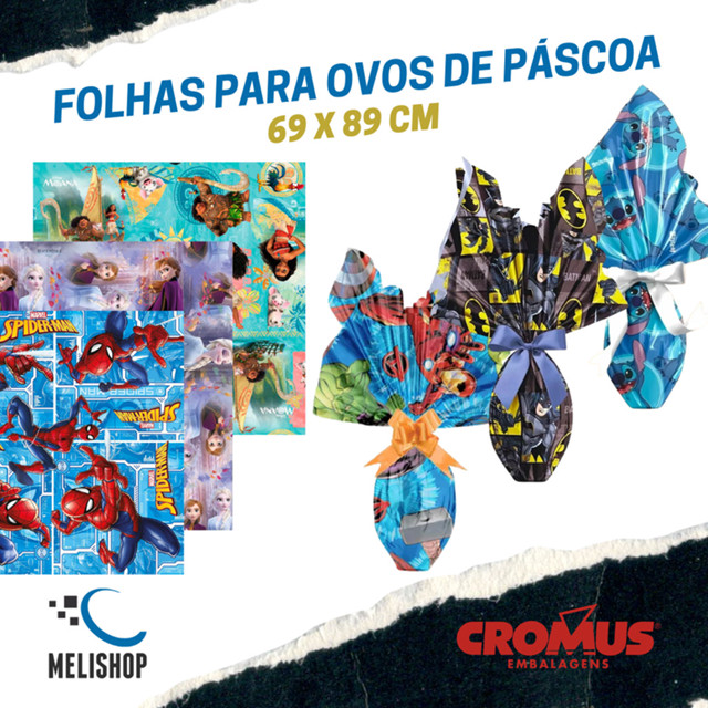 Kit 5/10/25 Folhas para Embrulhar Presente e Ovos de Páscoa Disney Batmam Stitch 69x89cm Cromus