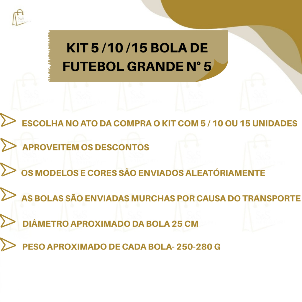 Kit 5 / 10 / 15 Bola de Futebol De Campo Grande nº 5 Tamanho Oficial Cores Sortidas, Resistente “ATENÇÃO NO MOMENTO DA COMPRA CUIDADO PARA NÃO ESCOLHER A OPÇÃO ERRADA, POIS TEMOS AS VARIAÇÕES COM 5, 10 E 15 BOLAS INFORMAÇÕES IMPORTANTES: "ENVIADA MURCHA PARA FACILITAR O TRANSPORTE"! • Não é possível escolher as cores, as bolas são enviadas aleatoriamente, de acordo com o estoque. • Cuidado para não encher muito a bola a ponto de estourar ou descosturar a mesma, pois não trocamos a bola furada pelo cliente. ORIENTAÇÕES IMPORTANTES DO MANUSEIO: • Tire a bola do saquinho plástico e abra a bola antes de encher, pois se não abrir vai furar a câmera. 🏆 Kit Bola de Futebol Campo Nº 5 Oficial | Resistente, Leve e Ideal para Treinos ⚽ 🎨 Cores Sortidas: (Estampa enviada aleatória) 🔥 Alta Performance para Diversão Sem Limites! 🔥 Chegou a bola perfeita para o seu jogo! Seja no campo, na praia ou no quintal, a Bola de Futebol Campo Nº 5 é a escolha certa para quem busca resistência, conforto e qualidade profissional. 💥 Destaques do Produto: ✅ Tamanho Oficial (Nº 5) – Ideal para partidas reais e treinos. ✅ Material Premium – PVC reforçado e vinil de alta durabilidade. ✅ Costura Resistente – Suporta chutes fortes sem descosturar. ✅ Multicolorida e Moderna – Estampas variadas que chamam atenção. 📦 Especificações Técnicas: 📏 Diâmetro aproximado: 25 cm ⚖️ Peso Médio: 260–280 g ** 🚚 Envio Imediato • Campo ⚽ • Praia 🏖️ • Rua 🛣️ • Quintal 🏡
