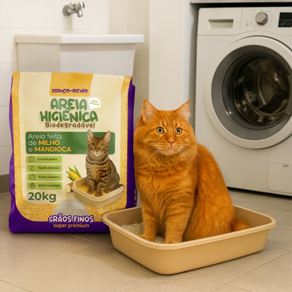 A Areia Higiênica Biodegradável Espaço do Bicho é uma opção super premium para a caixa de areia do seu gato, feita de milho e mandioca, com grãos finos e 100% natural. Desenvolvida para oferecer mais praticidade no dia a dia, ela forma torrões firmes, tem rápida absorção e ajuda a manter o ambiente mais limpo por ser livre de poeira. Benefícios: Livre de poeira: contribui para um ambiente mais limpo ao redor da caixa. Rápida absorção: ajuda a controlar a umidade e facilita a rotina. Torrão resistente: forma aglomerados firmes para uma remoção prática. Melhor aceitação: grãos finos que costumam agradar mais aos gatos. Diferenciais: Biodegradável e de origem vegetal (milho e mandioca). Grãos finos (super premium) para melhor conforto das patinhas. Modo de uso: Despeje a areia na bandeja sanitária, formando uma camada de aproximadamente 5 a 7 cm. Diariamente, retire os torrões e resíduos sólidos com uma pá. Complete com mais areia para manter a altura ideal Faça a limpeza completa da bandeja periodicamente (conforme uso), lavando e secando bem antes de reabastecer.