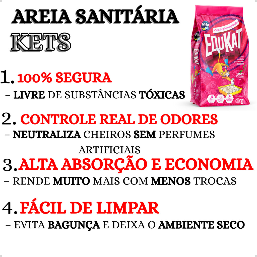 Areia Sanitária Natural para Gatos – Limpeza, Segurança e Economia_x000d_ _x000d_ Nossa Areia Sanitária Natural foi desenvolvida para oferecer alta absorção, efeito prolongado e segurança total, sem aditivos químicos que possam prejudicar a saúde do seu felino._x000d_ _x000d_ 100% segura – livre de substâncias tóxicas_x000d_ Controle real de odores – neutraliza cheiros sem perfumes artificiais_x000d_ Alta absorção e economia – rende muito mais com menos trocas_x000d_ Fácil de limpar – evita bagunça e deixa o ambiente seco_x000d_ Ideal para ambientes internos – perfeita para casas e apartamentos_x000d_ _x000d_ Ficha Técnica:_x000d_ Produto: Kit 5 Areia Sanitária Natural para Gatos EduKat 4 kg (fardo fechado)_x000d_ Finalidade: Absorção de urina e controle de odores_x000d_ Indicação: Gatos de todas as idades_x000d_ Composição: Argila/Bentonita/Saponnita_x000d_ Livre de químicos: Sim_x000d_ Controle de odores: Sim, sem fragrâncias artificiais_x000d_ Granulometria: Média_x000d_ Rendimento: Alta absorção com efeito prolongado_x000d_ Modo de uso: Cobrir o fundo da bandeja com aproximadamente 5 cm de areia. Remover os torrões formados diariamente e repor conforme necessário._x000d_ _x000d_ Por que escolher nossa areia sanitária e não a dos concorrentes?_x000d_ Nossa areia sanitária é eficiente de verdade, mantendo o ambiente seco e livre de odores por muito mais tempo. Diferente das opções comuns do mercado, ela não forma lama, não exige trocas constantes e é totalmente segura para o seu gato. Além disso, proporciona um custo-benefício superior, unindo praticidade, durabilidade e cuidado com a saúde do seu pet.