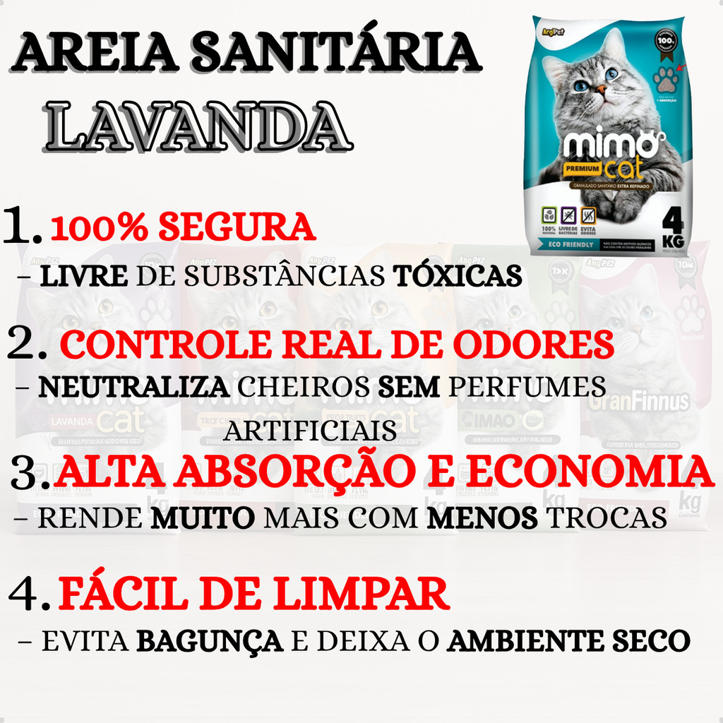 Areia Sanitária Natural para Gatos – Limpeza, Segurança e Economia Nossa Areia Sanitária Natural foi desenvolvida para oferecer alta absorção, efeito prolongado e segurança total, sem aditivos químicos que possam prejudicar a saúde do seu felino. 100% segura – livre de substâncias tóxicas Controle real de odores – neutraliza cheiros com fragrância suave Alta absorção e economia – rende muito mais com menos trocas Fácil de limpar – evita bagunça e deixa o ambiente seco Ideal para ambientes internos – perfeita para casas e apartamentos Ficha Técnica: Produto: Areia Sanitária Natural para Gatos Mimo Cat Premium 4kg (20kg fardo fechado) Finalidade: Absorção de urina e controle de odores Indicação: Gatos de todas as idades Composição: Argila Livre de químicos: Sim Controle de odores: Sim, com fragrâncias artificiais Granulometria: Extra Refinado Rendimento: Alta absorção com efeito prolongado Modo de uso: Cobrir o fundo da bandeja com aproximadamente 5 cm de areia. Remover os torrões formados diariamente e repor conforme necessário. Por que escolher nossa areia sanitária e não a dos concorrentes? Nossa areia sanitária é eficiente de verdade, mantendo o ambiente seco e livre de odores por muito mais tempo. Diferente das opções comuns do mercado, ela não forma lama, não exige trocas constantes e é totalmente segura para o seu gato. Além disso, proporciona um custo-benefício superior, unindo praticidade, durabilidade e cuidado com a saúde do seu pet.