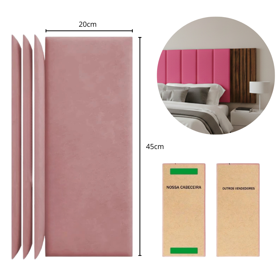 🛏️ Cabeceira Estofada Modular em Courino (Corino) + 4 Ripado MDF Design moderno e elegante para cama box solteiro, casal, queen ou king. Produto modular, com espuma macia, instalação sem furo e fita dupla face inclusa. Renove seu quarto com praticidade e sofisticação. ✅ Características: • Cabeceira estofada em courino premium • Painel ripado MDF 45×10 cm • Cabeceira estofada 45×20 cm • Espuma 3 cm (mais conforto) • MDF 3 mm • Produto modular – monte como desejar • Acompanha fita dupla face premium • Instalação rápida, sem furar a parede Kit Solteiro 5 Cabeceiras + 4 Ripados Kit Casal 7 Cabeceiras + 4 Ripados Kit Queen 8 Cabeceiras + 4 Ripados Kit King 10 Cabeceiras + 4 Ripados