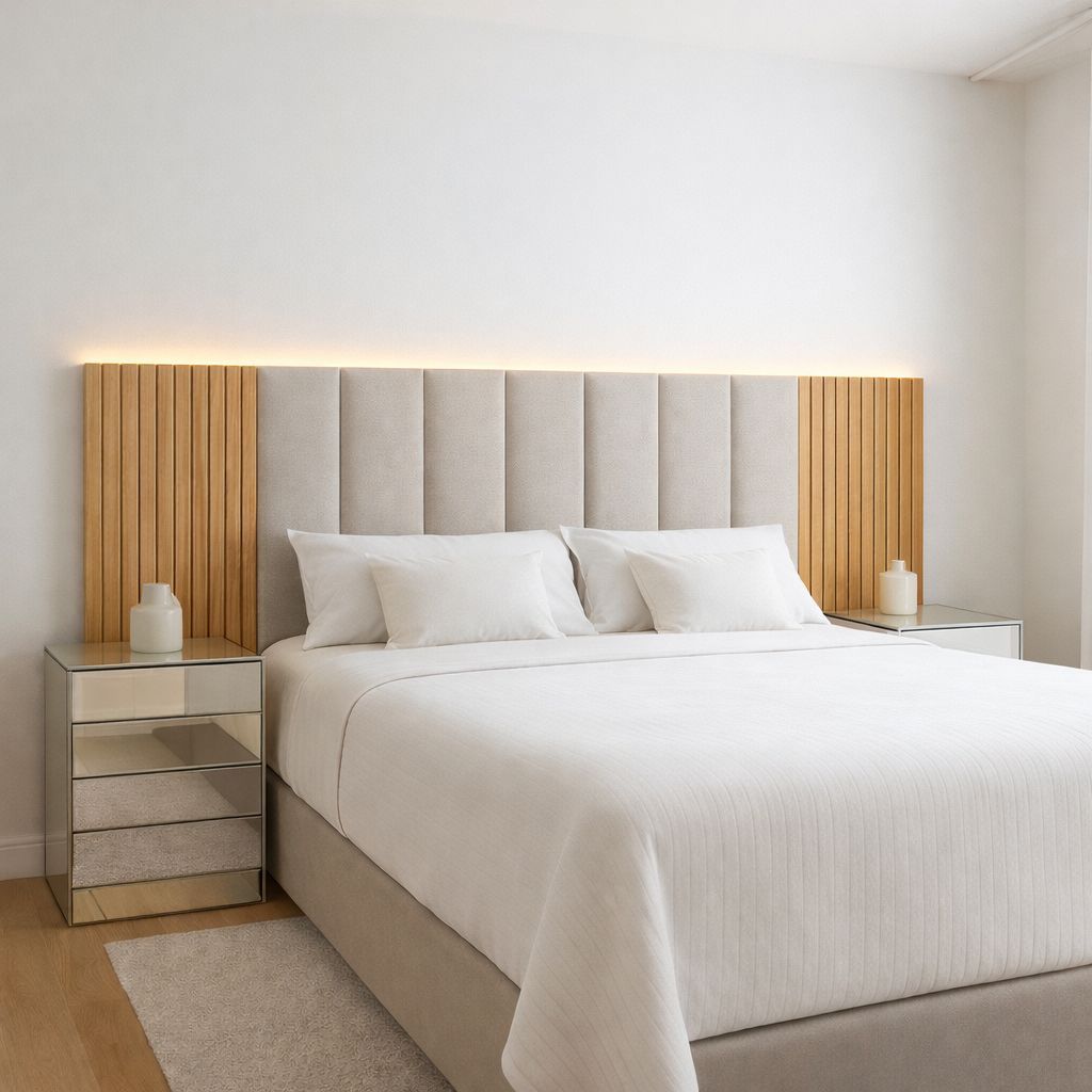 🛏️ Cabeceira Estofada Modular em Courino (Corino) + Ripado MDF Design moderno e elegante para cama box solteiro, casal, queen ou king. Produto modular, com espuma macia, instalação sem furo e fita dupla face inclusa. Renove seu quarto com praticidade e sofisticação. ✅ Características: • Cabeceira estofada em courino premium • Painel ripado MDF 45×10 cm • Cabeceira estofada 45×20 cm • Espuma 3 cm (mais conforto) • MDF 3 mm • Produto modular – monte como desejar • Acompanha fita dupla face premium • Instalação rápida, sem furar a parede Kit Solteiro 5 Cabeceiras + 4 Ripados Kit Casal 7 Cabeceiras + 4 Ripados Kit Queen 8 Cabeceiras + 4 Ripados Kit King 10 Cabeceiras + 4 Ripados