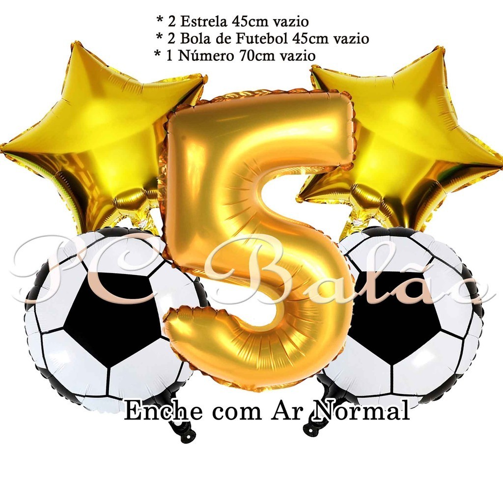Kit 5 Balão Metalizado 2 Bola de Futebol 22cm + Número 40cm DOURADO + 2 Estrela 22cm DOURADO Festa