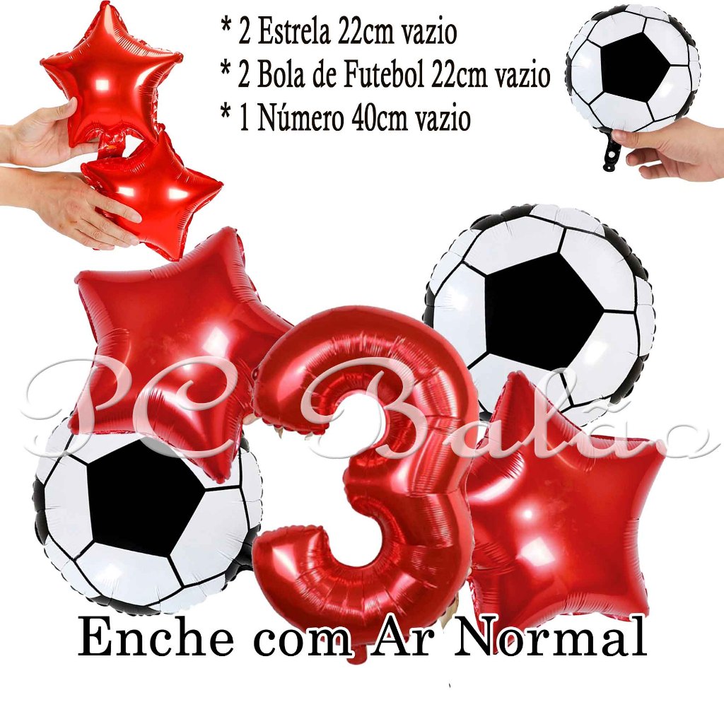 Kit 5 Balão Metalizado 2 BOLA DE FUTEBOL 22CM + Número 40cm VERMELHO + 2 Estrela 22CM VERMELHO Festa