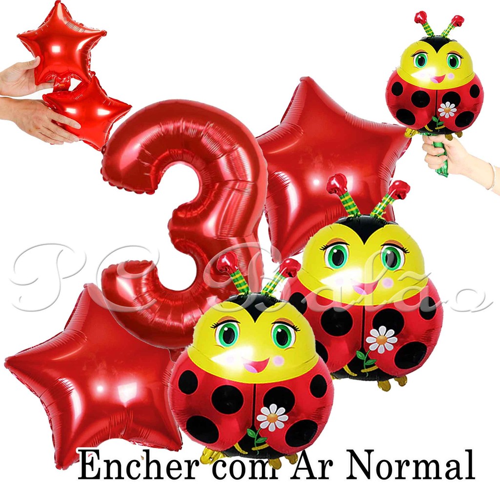 Kit 5 Balão Metalizado 2 JOANINHA PEQUENA + N° 40CM VERMELHO 2 ESTRELA VERMELHA JARDIM