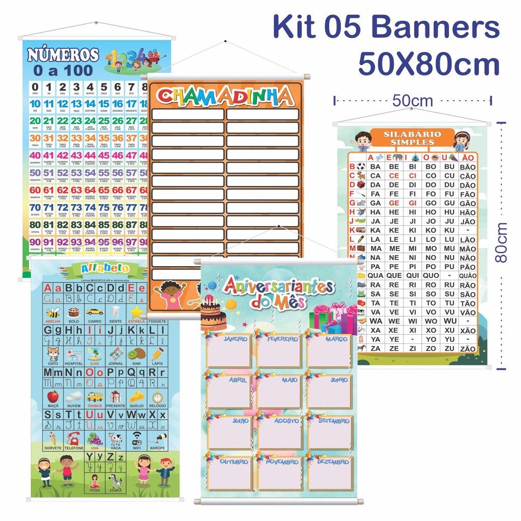 Kit 5 Banners Pedagógico Sílabas Silabário Simples Alfabeto Aniversariantes Chamadinha Número