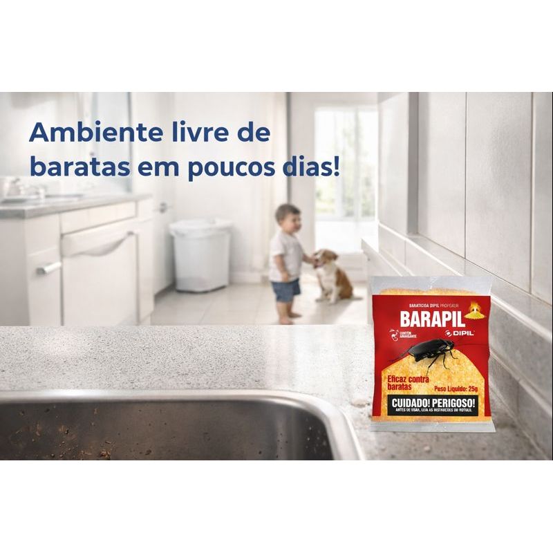 Elimine as baratas sem cheiro, sujeira ou esforço. Barapil Isca Granulada 25g é a solução profissional e discreta para quem quer acabar de vez com as baratas de cozinha e esgoto, sem precisar de sprays, sujeira ou misturas caseiras que não funcionam. Simples, seguro e potente. Uma aplicação estratégica do granulado e você reduz drasticamente a infestação em poucos dias. Por que o Barapil é a escolha de quem já tentou de tudo? * Atuação silenciosa e eficaz: elimina baratas sem que você precise ver ou encostar nelas * Tecnologia com Propoxur: ingrediente poderoso usado por dedetizadoras * Ideal para áreas críticas: ralos, cantos da cozinha, gavetas, lixeiras, lavanderia * Contém amargante: evita ingestão acidental por crianças ou pets * Ação prolongada: proteção contínua por até 4 semanas após aplicação Modo de uso: 1. Aplique pequenas quantidades nos locais de passagem das baratas, como cantos de armários, embaixo da geladeira, próximo a ralos e pias. 2. Não é necessário espalhar ou encostar diretamente nos insetos. 3. Substitua a isca a cada 15 dias ou sempre que for consumida. Conteúdo da Embalagem: * 1 unidade de Barapil Isca Granulada – 25g * Pronta para uso direto da embalagem PERGUNTAS FREQUENTES (FAQ): 1. O produto tem cheiro forte? Não. O Barapil é inodoro, ideal para ambientes fechados como cozinha, banheiro e quarto. 2. Pode ser usado em casa com pets ou crianças? Sim. Contém amargante, que torna o produto repulsivo em caso de ingestão acidental. Ainda assim, deve ser aplicado fora do alcance. 3. Quanto tempo leva para fazer efeito? A ação começa nas primeiras 24 horas. Em infestação leve, já é possível notar redução em 2 dias. 4. É eficaz contra baratas grandes e do esgoto? Sim. A isca é atrativa para diferentes tipos de baratas, inclusive as maiores e mais resistentes. 5. Substitui a dedetização? Em muitos casos, sim. O Barapil age de forma profissional sem necessidade de contratar serviços de dedetização frequente.
