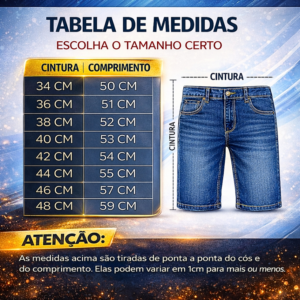 Kit 5 Bermudas Jeans Masculino Original Tradicional Slim > com Elastano > Qualidade Premium > Envio Imediato! Olá, Sejam bem vindos a marca Malybu Jeans, estamos localizados na região de São Paulo e enviamos para todo o Brasil. Fabricamos diversos modelos com intuito de atender o gosto de cada cliente. Procuramos entender cada detalhe para que sinta-se confortável e se identifique cada dia mais com nossa marca. **FABRICAÇÃO PRÓPRIA** LOJA OFICIAL MALYBU JEANS Enviamos o seu pedido no mesmo dia! FICHA TÉCNICA: - Tecido encorpado, macio e confortável. - Qualidade Premium. - Lavagem moderna. - Modelo da foto veste tamanho 42 CARACTERÍSTICAS PRINCIPAIS: Marca: MALYBU JEANS Modelo: Jeans Gênero: Masculino Tipo de Short Slim Fit Cintura: Médio Material principal: Jeans com lycra Composição: 96% Algodão 4% Elastano ****CONFIRAM A TABELA DE TAMANHOS ANTES DE CONFIRMAR SUA COMPRA**** TABELA DE MEDIDAS: Num.---- Cintura ---- Quadril ---- Compr. 38 ------- 80cm ------ 88cm ------ 50cm 40 ------- 84cm ------ 90cm ------ 52cm 42 ------- 89cm ------ 94cm ------ 54cm 44 ------- 91cm ------ 96cm ------ 56cm 46 ------- 95cm ------ 103cm ---- 58cm 48 ------- 97cm ------ 108cm ---- 60cm *Compare com uma peça sua e faça a escolha correta, orientamos todos nossos clientes sempre comprar um tamanho acima para ficar confortável ao seu corpo! - Para você que quer renovar seu guarda-roupa com o menor custo benefício do mercado, está na loja certa. Nossos produtos são de ótima qualidade e vestem super bem. *Vendemos barato para garantir que todos tenham direito de se vestir bem gastando pouco, estamos no Mercado a mais de 20 anos, somos o Maior Fabricante de Jeans no Brasil, enviamos no mesmo dia!!! - TEMOS BERMUDAS JEANS NOS TONS: JEANS CLARO, MÉDIO, MARMORIZADO, ESCURO e PRETO. RECOMENDAÇÃO DE USO: - Usar sabão neutro. - Secar na sombra. DUVIDAS: Chame pelo CHAT que daremos todo suporte necessário, boas compras!