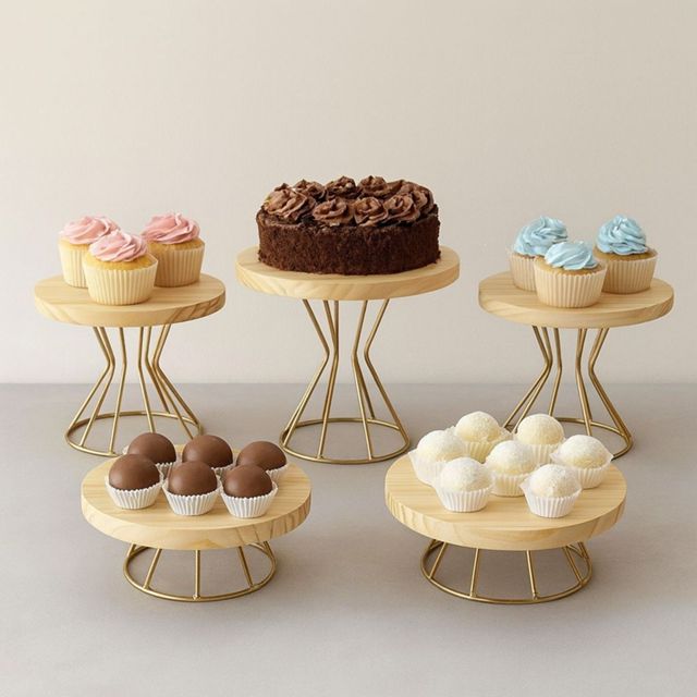 Kit 5 Boleiras Decorativas Madeira com Base Dourada | Suporte para Bolos e Doces Festa