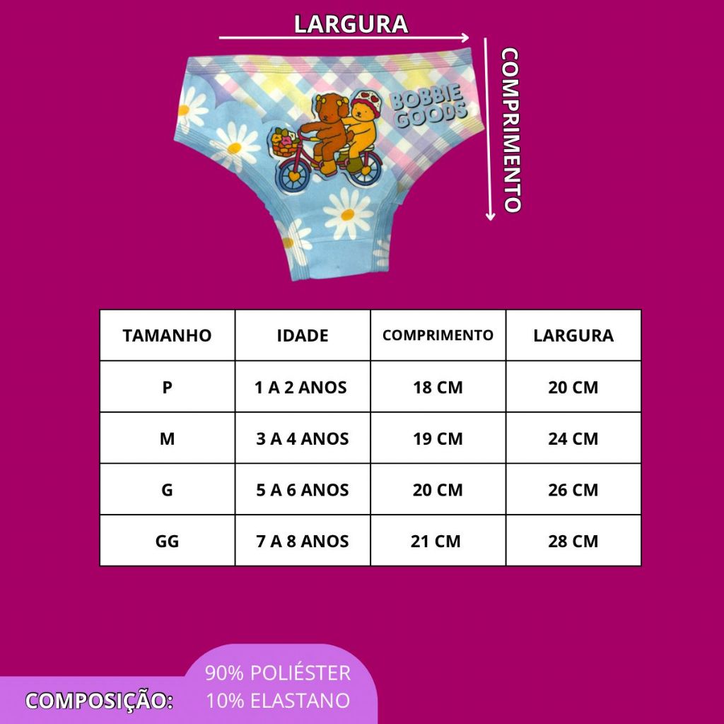 Kit com 5 Calcinhas Infantis da Bobie Goods – Edição Limitada! Conforto, Qualidade e Estampas Encantadoras! Nosso kit com 5 calcinhas sublimadas é feito em microfibra de alta qualidade, com viés macio para um ajuste perfeito e confortável ao corpo. Perfeita para garantir segurança e comodidade em qualquer ocasião! * Edição limitada – aproveite antes que acabe! * Kit com 5 calcinhas estampadas da Bobie Goods (sublimadas frente e costas, sem desbotar!) * Com forro para mais conforto! * Sem repetições de estampas * Composição: 90% poliéster | 10% elastano * Tamanhos disponíveis – Confira a tabela de medidas nas fotos! * Todas as calcinhas têm estampas da Bobie Goods! Se quiser uma específica, consulte a disponibilidade. Ficamos à disposição para qualquer dúvida!