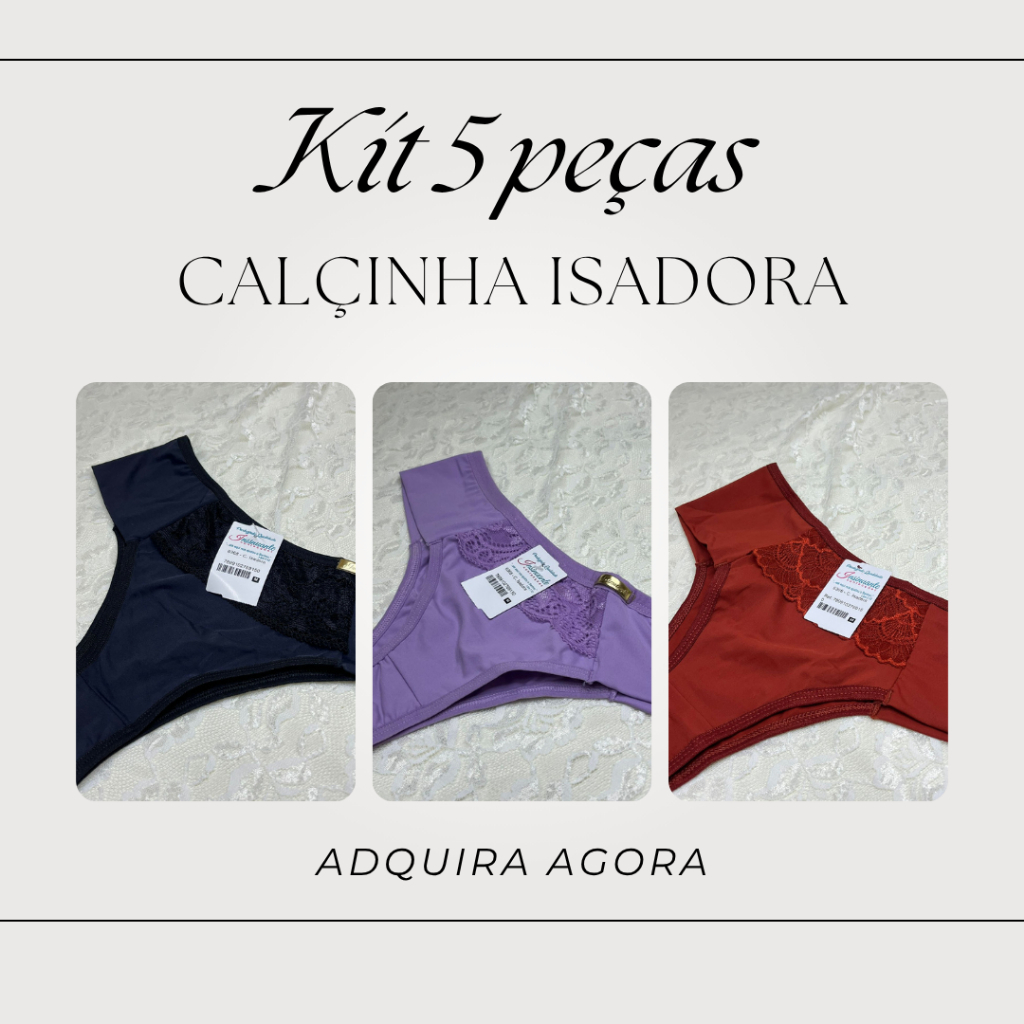 A poliamida é um dos melhores tecidos para lingerie porque: ✅ Toque macio e sedoso – parece uma segunda pele. ✅ Respira melhor, não abafa e evita desconforto. ✅ Seca rápido e não fica úmida como outros tecidos. ✅ Não deforma e não desbota fácil, mesmo depois de várias lavagens. ✅ Mais durável e confortável para o dia a dia. ⚠️ E por que evitar poliéster na lingerie? Exemplos: SUPLEX, ROMANTIC, poliamida misturada com poliéster. ❌ Abafa a pele → esquenta e dá sensação de suor. ❌ Demora a secar → fica úmido e pode causar mau odor. ❌ Toque mais áspero comparado à poliamida. ❌ Menos durável → pode lacear e perder o caimento. - ESSE ANUNCIO SE REFERE AO KIT COM 5 CALCINHAS ISADORA FEITA EM MICROFIBRA COM RENDA NA FRENTE. ***POR FAVOR, O KIT IRÁ COM COR SORTIDA, PODE ACONTECER DE IR COR REPETIDA E IRÁ A COR REPETIDA QUE TIVER EM ESTOQUE. SEM OPÇÃO DE ESCOLHA DA COR. OU SE QUISER OUTRA COMBINAÇÃO DE CORES, ESCOLHER CORES VARIADAS E NOS ENVIAR AS CORES DESEJADAS POR CHAT OU COLOCAR NA OBSERVAÇÃO.** ITENS INCLUSOS: - 5 CALCINHA FEMININA ISADORA Produto 100% original, com garantia e nota fiscal. DESCRIÇÃO DO PRODUTO: -A Calçinha Microfibra oferece máximo conforto. Feito em microfibra macia, com renda que garante um ajuste perfeito sem atrito. As laterais mais largas e cintura média proporcionam ampla cobertura, sendo ideal para diferentes tamanhos. O tecido permite a passagem de ar, prevenindo umidade e bactérias, mantendo a saúde da pele. Perfeito para o dia a dia. CARACTERÍSTICAS: - Confeccionado em microfibra de toque macio e super confortável. - As Laterais são mais largas e sem costura para não causar atrito na pele. - Forro 100% Algodão - Ideal para o dia a dia. TAMANHOS: - M - G - GG COMPOSIÇÃO DA CALÇINHA: - 90% Poliamida - 10% Elastano COMPOSIÇÃO RENDA: 90% Poliamida - 10% Elastano COMPOSIÇÃO FORRO: -100% Algodão **POSTAGEM:** Se o pagamento for confirmado até as 12:00, postamos o pedido no mesmo dia. Exceto Sábados, Domingos e Feriados. **INSTITUCIONAL:** Há mais de 30 anos no mercado oferecendo a melhor experiência, a Insinuante é líder de vendas e continua crescendo mês a mês, sempre prestando um bom atendimento a um preço justo. Trabalhamos somente com produtos originais e priorizamos a agilidade na entrega do produto e qualidade no atendimento, visando proporcionar a melhor experiência possível para nossos clientes.