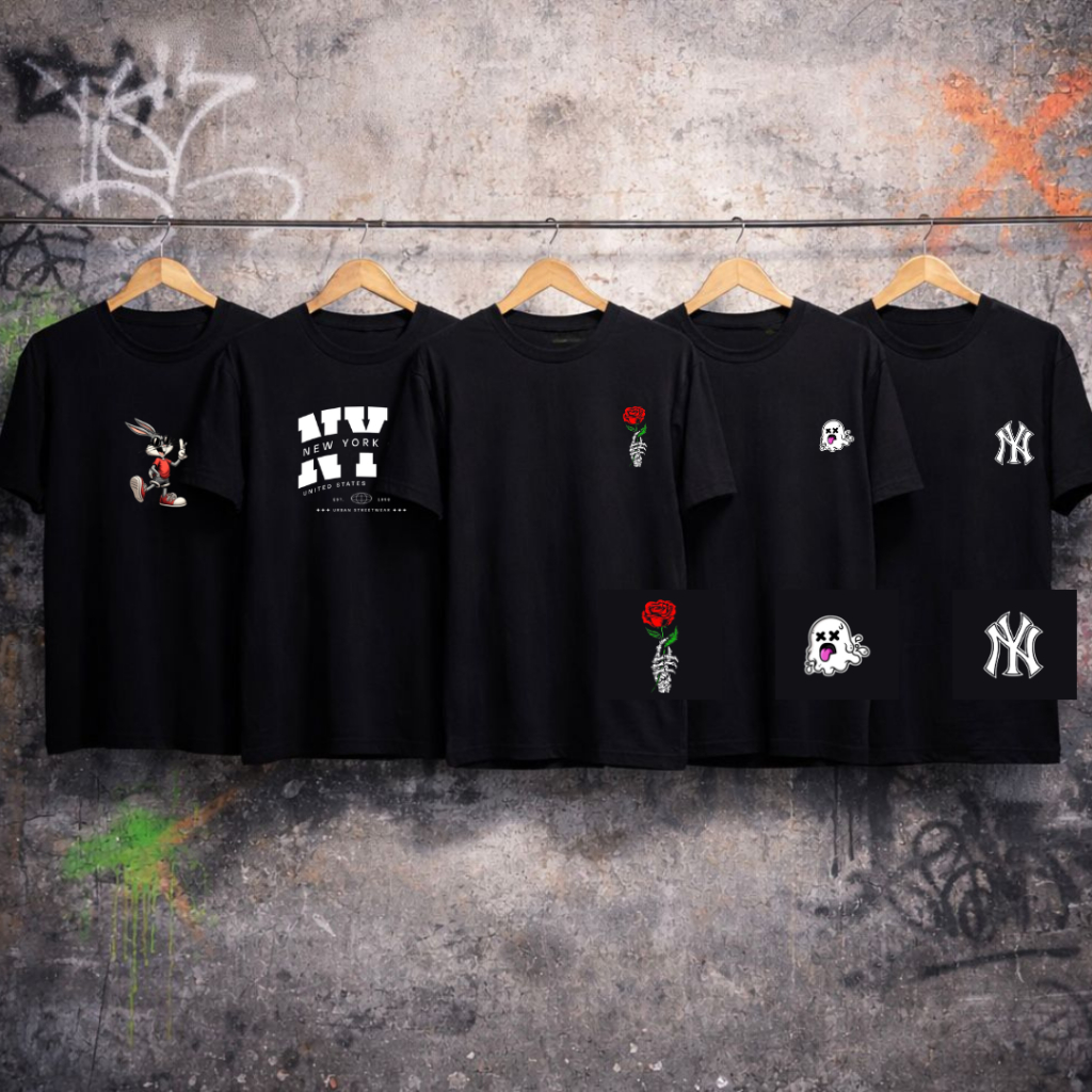 KIT 5 CAMISETAS 100% ALGODÃO PREMIUM - CONFORTO E ESTILO - ESTAMPAS SORTIDAS **Kit com peças somente na cor Preta** Descubra o conforto e a qualidade das nossas camisetas Street Wear, produzidas com algodão 100% premium, proporcionando uma sensação macia e agradável na pele durante todo o dia. Nossa malha é respirável, ideal para dias quentes ou para te acompanhar na rotina de academia, treino, lazer ou uso casual. A estampa é feita em DTF (Direct to Film), uma das tecnologias mais modernas do mercado, garantindo alta definição, cores vivas e maior durabilidade, mesmo após várias lavagens. POR QUE COMPRAR NOSSAS CAMISETAS? Kit econômico Tecido 100% algodão de alta qualidade Estampa em DTF com acabamento premium Conforto ideal para o dia a dia, academia e estilo streetwear Design básico e moderno que combina com tudo Reforço nos ombros para maior durabilidade Modelagem padrão brasileira DÚVIDAS FREQUENTES 1. A estampa desbota? Não. A tecnologia DTF garante maior fixação e resistência da estampa, mesmo após diversas lavagens. 2. A camiseta é unissex? Sim! O modelo é unissex, com modelagem reta que veste bem tanto no público masculino quanto feminino. 3. Tem troca ou devolução? Sim, seguimos a política de devolução conforme o Código de Defesa do Consumidor. Em caso de dúvidas, entre em contato conosco. 4. A estampa é na Frente? Sim, neste Kit as estampas são somente na frente! DICAS DE LAVAGEM Lavar à mão ou na máquina no ciclo delicado Não usar alvejante Não passar o ferro diretamente sobre a estampa Secar à sombra para preservar a cor e durabilidade Evitar torcer com força a peça Invista em conforto, durabilidade e estilo com as nossas camisetas . Seu look casual nunca foi tão versátil!
