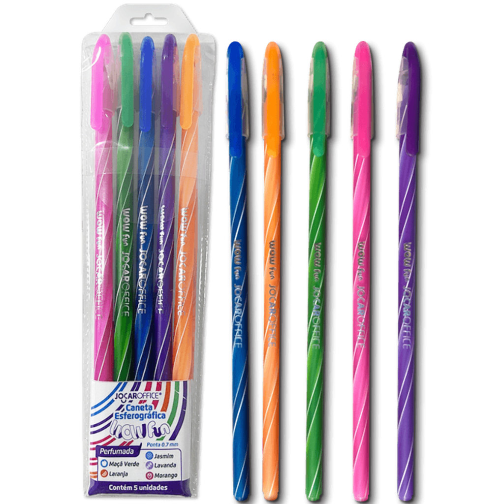 **Descrição** Caneta Esferográfica Perfumada Wow Fun Ponta 0.7mm, além de causar surpresa e impacto visualmente, ao usar dá para sentir a diversão em todos os traços, linhas e rabiscos coloridos que ela faz, sem contar que ela é perfumada, com a tinta exalando aromas de maçã verde, jasmim, laranja, morango e lavanda! Isto é: são 5 cores e 5 aromas, seu design moderno, longo e colorido em espiral do corpo é um dos seus diferenciais.
