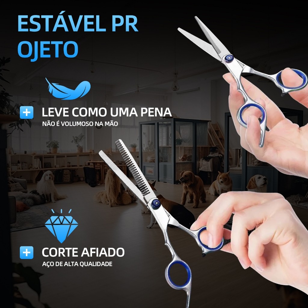 Kit Profissional de Corte e Estilo para Pets: Eleve a tosa do seu pet para o Próximo Nível! Dê ao seu companheiro peludo o tratamento que ele merece com o nosso novo Kit Profissional de Corte e Estilo para Pets. Desenvolvido para atender às necessidades dos amantes de animais, este conjunto exclusivo oferece ferramentas de alta qualidade para um cuidado excepcional com seus animais de estimação. * Tesoura Padrão Para Tosa (17 cm): Perfeita para cortes precisos e detalhados, garantindo um acabamento impecável e elegante. * Tesoura para Desbaste (17 cm): Projetada para criar camadas suaves e naturais, proporcionando um visual profissional e confortável para o seu pet. * Tesoura Curva (17 cm): Ideal para áreas delicadas e curvas, permitindo um corte preciso em regiões mais difíceis. * Escova de Qualidade Premium (19 cm): Com cerdas suaves e resistentes, esta escova ajuda a manter a pelagem do seu animal macia, brilhante e livre de nós, com diferentes espaçamentos entre os dentes para atender dos pelos mais finos aos mais volumosos. * Pano de limpeza * Cor: Prata c/Azul e Prata c/Rosa Recursos e Benefícios: Alta Qualidade: Tesouras afiadas e duráveis, projetadas para durar e resistir ao uso frequente. Versatilidade: Adequado para todos os tipos de pelagem, proporcionando resultados excepcionais em diversas raças. Conforto: Cabos ergonômicos garantem uma experiência de tosa confortável tanto para você quanto para o seu pet. Estilo Profissional em Casa: Economize tempo e dinheiro com este conjunto completo, permitindo que você mantenha a pelagem do seu animal de estimação no conforto da sua casa.