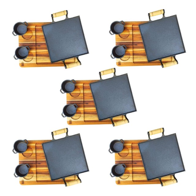 Kit 5 Chapa e Cumbucas de Ferro Fundido Churrasco com Tábua de Madeira Carne Petisco Porção Molheira