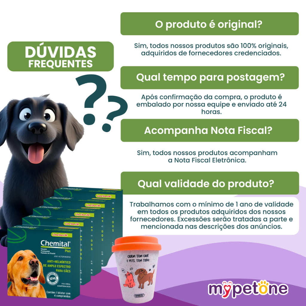🐶 Chemital Plus para Cães + Copo Café Pet ☕ – Proteção Completa Contra Vermes! ✅ Amplo espectro ✅ Seguro para fêmeas prenhes ✅ Copo de Café exclusivo incluso! 🐾 Dê adeus aos vermes e proteja a saúde do seu cão com segurança e praticidade! O Chemital Plus da Chemitec é um vermífugo de uso oral que combate com eficiência os principais vermes que atingem os cães, incluindo cestóides, ancilostomídeos, ascarídeos e tricurídeos – responsáveis por sintomas como perda de peso, fraqueza, diarreia e pelagem opaca. Sua fórmula poderosa com Praziquantel, Pamoato de Pirantel e Febantel garante ação eficaz e ampla margem de segurança, sendo indicado inclusive para fêmeas gestantes, em qualquer fase da gestação. 🎁 Especial Copo de Café Pet incluso! Leve na compra do produto – um mimo para quem cuida com carinho! ✨ Benefícios do Chemital Plus Cães: - Combate completo contra vermes intestinais - Seguro para cães de todas as idades, inclusive prenhes - Pode ser administrado junto à ração ou alimentos - Não exige jejum ou cuidados prévios - Alta palatabilidade 📦 O que você recebe: 5 Caixas de Chemital Plus Cães 1 Copo de Café Pet (exclusivo)