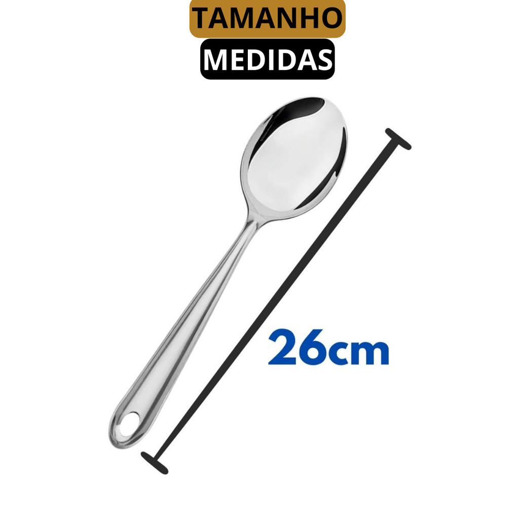 KIT 5 Colher De Arroz GRANDE Cabo Longo 100 % Aço Inox 26cm Casa Restaurante Buffet A colher de arroz inox de 26 cm é um utensílio de cozinha projetado especificamente para servir porções de arroz de forma prática e elegante. Sua construção em aço inoxidável garante durabilidade e resistência, tornando-a ideal para uso doméstico e comercial. Além de servir arroz, pode ser utilizada para servir uma variedade de outros alimentos, como feijão, risoto e saladas. É um item essencial em qualquer cozinha, sendo adquirido por consumidores domésticos que valorizam a praticidade e a qualidade dos utensílios de cozinha, bem como por restaurantes, buffets e outros estabelecimentos comerciais que buscam utensílios duráveis e funcionais para o serviço de refeições. Encontrada em lojas especializadas em utensílios de cozinha e grandes varejistas em todo o Brasil, a colher de arroz inox de 26 cm é uma escolha versátil e conveniente para quem busca facilitar o serviço à mesa.