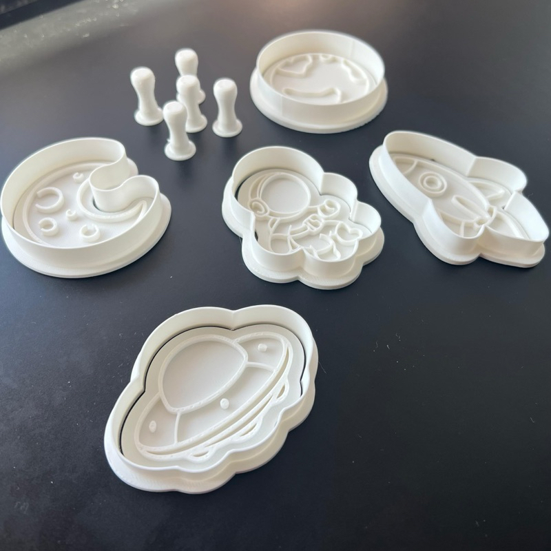 KIT 5 Cortador Biscoito e Carimbo Forma ASTRONAUTA/ESPAÇO Aprox 6cm Com Puxador
