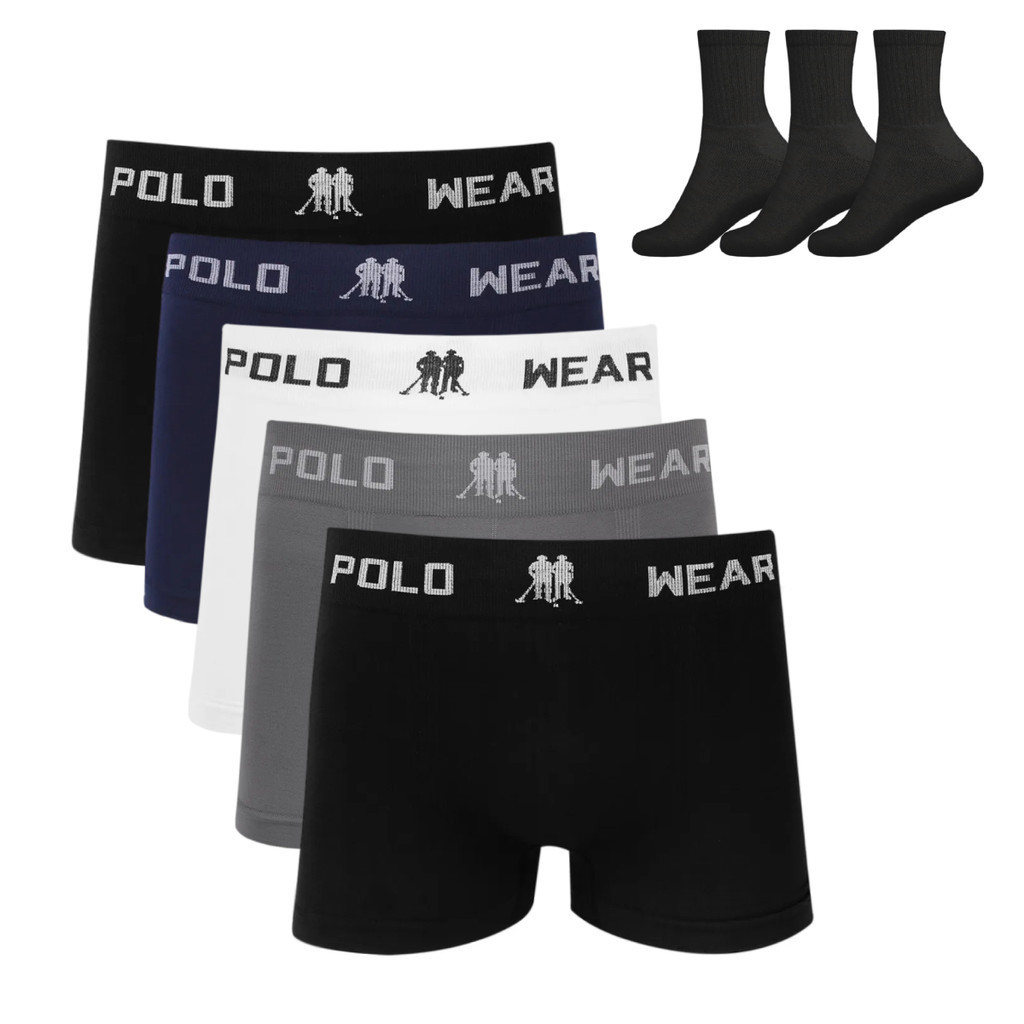Kit 5 Cueca Boxer Polo Wear Microfibra Sortido + 3 Meias Pretas Cano Médio