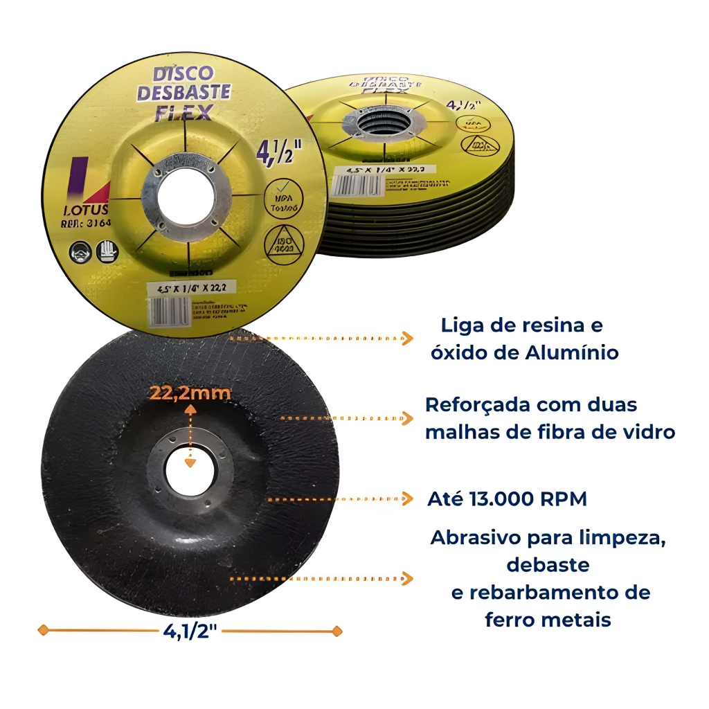 | Kit 5 Discos Desbaste 4,5 X 1/4 X 22.2mm Flex Lotus este produto | R$ 22,90 | — | 5.0/5 | 32 |