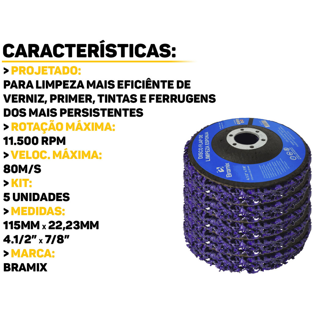 Kit 5 Discos Desbaste Limpeza Removedor Polidor Tinta Fundo Ferrugem Verniz Para Madeira Concreto 115mm