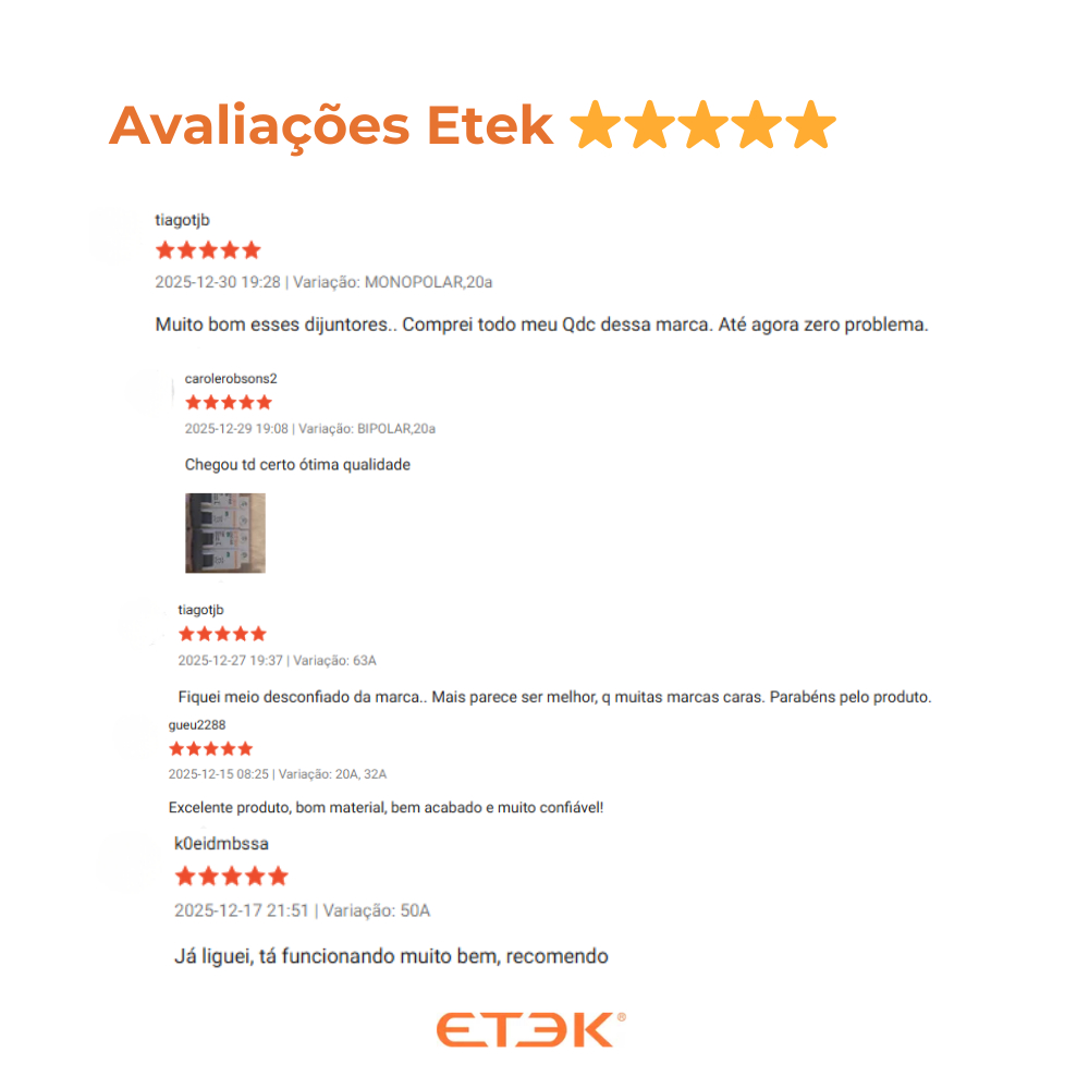 Os disjuntores DIN ETEK são equipamentos de alta tecnologia que protegem fios e cabos elétricos contra curtos-circuitos e sobrecargas de energia, proporcionando aplicações seguras e econômicas em instalações elétricas residenciais, comerciais e industriais. O disjuntor de curva C tem como característica o disparo instantâneo para correntes entre 5 a 10 vezes a corrente nominal. Sendo assim, são aplicados para a proteção de circuitos com instalação de cargas indutivas. Como por exemplo: ar condicionado, micro-ondas, lâmpadas fluorescentes, geladeiras, máquinas de lavar, etc. Para adicionar múltiplas amperagens você deve selecionar a amperagem que deseja, escolher a quantidade desejada e clicar no botão "adicionar ao carrinho" que fica logo abaixo de "comprar agora". Você pode repetir este processo quantas vezes precisar para adicionar produtos diferentes ao carrinho, finalizando a compra somente após todos os itens serem selecionados. Atenção! Escolha a AMPERAGEM antes da compra. Caso queira várias amperagens, selecione a amperagem desejada e adicione no carrinho de compra UMA POR VEZ; CONTEÚDO DA EMBALAGEM: 05 unidades de Disjuntor DIN Monopolar Curva C Termomagnético Etek Detalhes técnicos: Fabricante: ETEK Modelo: EKM2-ST Indicador de posição de contato: Verde desligado - Vermelho ligado Função: Proteção contra curto-circuito e sobrecarga em instalações elétricas residenciais, comerciais e industriais. Tensão Nominal de Isolação Ui: 230/400Vca Tensão de Operação Ue: 50/60hz Correntes Nominais (In): 6A, 10A, 16A, 20A, 25A, 32A, 40A, 50A, 63A Número de Pólos: 1 Curva de disparo: C Temperatura de Operação: -5ºC a 40ºC Fixação: Trilho DIN 35mm Manobras Mecânicas: > 4.000 Manobras Elétricas: > 4.000 Grau de Proteção: IP 20 Secção de Condutores: 1 a 25mm²